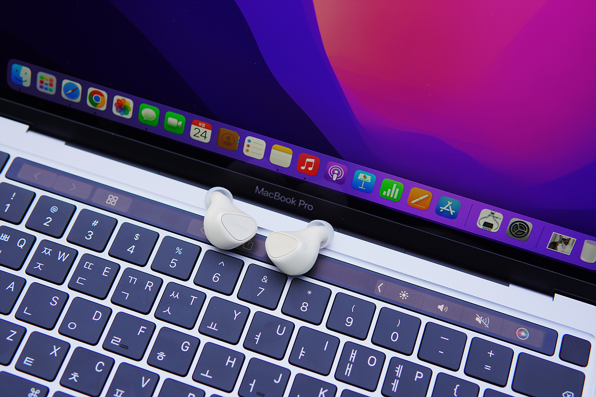 이어버드 버튼에 있는 Jabra의 "J", "A" 글자 양쪽에는 외부 소리를 수음하기 위한 마이크가 있으며 바람 소리를 줄여주기 위해 작은 구멍들이 여러 개 뚫려있지만 완벽하게 차단되지는 않더군요. 노이즈 캔슬링을 켠 상태에서 음악을 들을 때는 살짝 거슬리는 정도지만 히어쓰루나 통화에서는 바람 소리가 더 크게 들려서 거슬렸습니다.