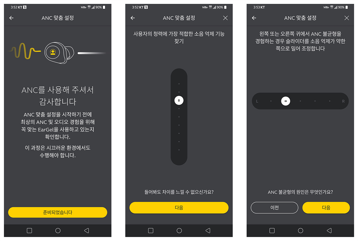 ANC의 경우 주변 소음에 맞춰서 테스트를 하면서 자신에게 맞는 강도를 설정할 수 있으며 좌우 균형까지 설정할 수 있습니다. 감도 조절과 함께 마음에 드는 부분이었습니다.