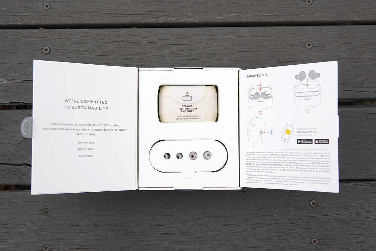 박스 안쪽에는 엘리트 5를 더욱 편리하게 사용할 수 있는 전용 앱(Jabra Sound +)에 대한 내용이 있습니다. Jabra Sound +는 IOS, 안드로이드 모두 지원하고 있습니다.