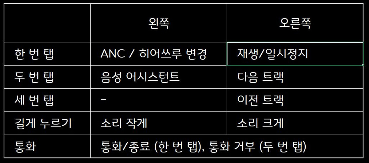 이어버드는 좌우 기능은 모두 다르게 할당되었으며 터치가 아닌 물리 버튼으로 동작하게 됩니다. 이어버드는 좌우 단독으로도 사용하더라도 기능 변화 없이 모두 그대로 이어집니다.