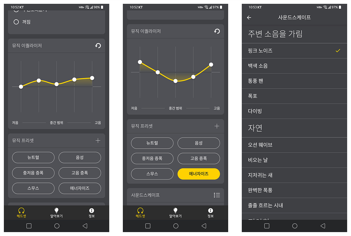사용자 EQ는 5 밴드로 설정할 수 있으며 미리 지정된 프리셋을 사용할 수도 있습니다. 개인적으로는 4/5단계에서 +2 정도를 하니 훨씬 더 좋았습니다. 공부하는 학생들이 좋아하는 백색 소음 효과(사운드 스케이프) 역시 다양하게 지원을 하고 있습니다.