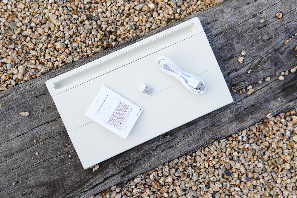 아이노트 X500RB의 가장 큰 특징이자 장점이라면 커버가 있어서 키보드를 안전하게 보호할 수 있다는 것과 이 커버를 접어서 팜레스트로 활용할 수 있다는 부분이죠. 대부분의 사용자들이 별도의 파우치나 케이스를 사용하지 않는다는 점을 생각한다면 꽤 유용한 기능입니다. 추가로 다른 블루투스 키보드에서는 보기 힘든 2.4GHz의 무선 수신기를 제공해서 블루투스를 사용할 수 없는 PC에서도 사용할 수 있습니다.