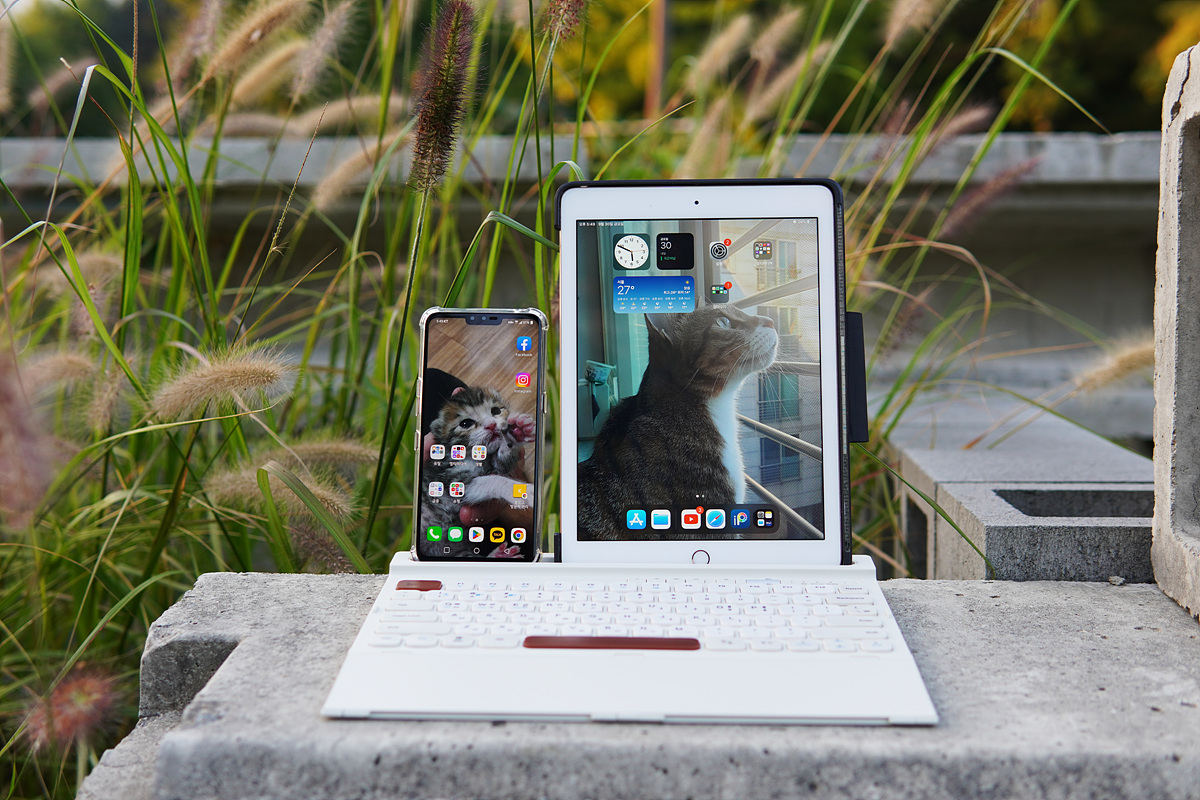 블루투스로 연결해서 키보드를 사용할 수 있을 뿐 아니라 단순 거치대로서의 역할도 충분했으며 스마트폰은 세로 모드로 최대 3대까지는 거치해서 올려놓을 수 있습니다.