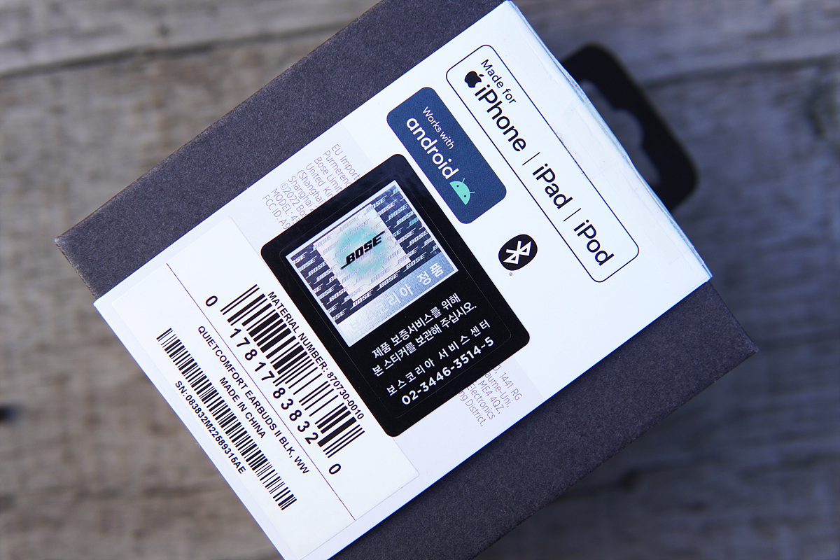 박스를 감싸는 띠는 봉인 스티커의 역할을 하고 있으며 뒤쪽에는 보스 코리아 정품 스티커가 부착되어 있습니다. (보스 코리아 정식 수입 제품에만 인증 스티커가 동봉됩니다.) 영수증뿐 아니라 이 스티커가 없으면 1년간의 무상 A/S를 받을 수 없으니 꼭 확인하시고 잃어버리지 않도록 조심하세요. QC 이어버드 2는 안드로이드뿐 아니라 애플의 IOS에서도 사용할 수 있으며 전용 앱 역시 모두 지원합니다.