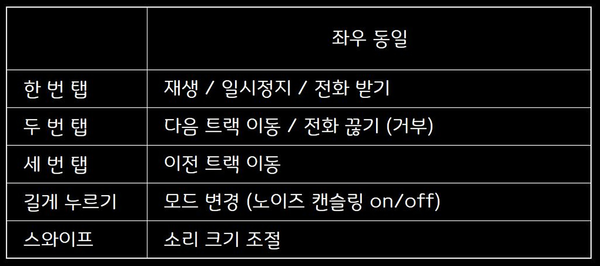 모드 변경은 전용 앱에서 바꿀 수 있지만 기본적인 기능은 표와 같습니다. 이어버드가 마스터 슬레이브(Master - Slave)로 연결이 돼서인지 좌우 동일하게 세팅이 된 거 같습니다. 마스터 슬레이브 방식의 연결이라 이어버드는 좌우 단독으로 사용할 수 없으며 마스터인 오른쪽만 단독으로 사용할 수 있습니다. 2022년에 출시된 제품에 이런 방식을 사용했다는 게 좀 이해가 되질 않네요. 제품의 가격을 생각한다면 더더욱 그렇습니다.