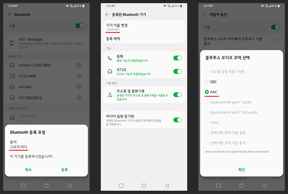 기기 검색을 하면 "고요의 바다"라는 다소 특이한 이름을 확인할 수 있으며 이름은 Bose Music 전용 앱에서 바꿀 수 있습니다. 코덱은 SBC, AAC만 지원하고 있으며 aptX HD, aptx Adaptive, LDAC와 같은 고음질 코덱은 지원하지 않습니다. 블루투스 기기를 소개하면서 여러 번 언급을 했지만 고음질 코덱이 소리에서 차지하는 비율은 많이 잡아야 10% 이내라고 생각합니다. 고음질 코덱이 이어폰이나 기기의 소리를 평가할 때 절대적이라고 하기는 힘들지만 그래도 제품의 가격을 생각한다면 분명 아쉬운 부분입니다.