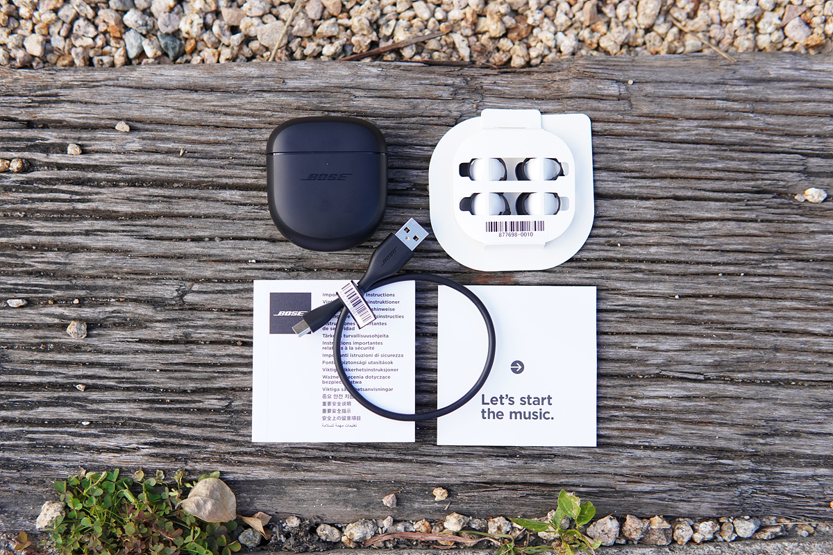 제품의 구성은 QC 이어버드 2 본품과 충전 및 보관 케이스, Bose 핏(Fit) 키트, 안전 지침서, 빠른 시작 설명서로 이루어져 있습니다. Bose 핏(Fit) 키트는 이어팁 3종(S, M, L)과 고정 밴드 3종(S, M, L)으로 이루어져 있는데요, 크기뿐 아니라 좌우 구분이 있으니 교체할 때는 꼭 확인을 하시기 바랍니다.