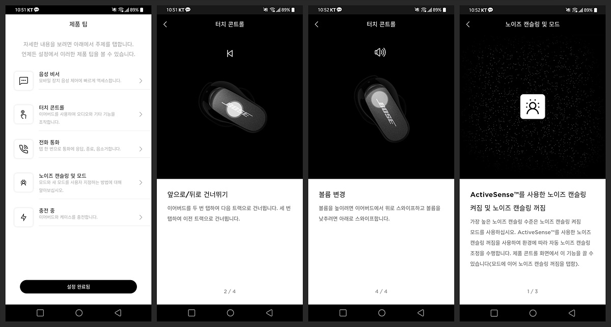 제품의 성능도 중요하지만 TWS에서는 자신에게 맞는 이어 팁 선택과 착용 방법 역시 상당히 크게 작용을 합니다. 이어 팁 결합 테스트에서는 자체 소리를 발생해서 귀의 바깥(외이도)을 테스트한 뒤 다시 마이크로 이 소리를 수음하고 측정을 하는 보스의 CustomTune 기술이 적용되었습니다. 이 과정에서 이어 팁이 제대로 장착(밀착)이 되었는지를 확인을 하고 사용자에게 알려줍니다. 착용감이나 소리가 이상하다면 꼭 한번 테스트를 해보세요.
