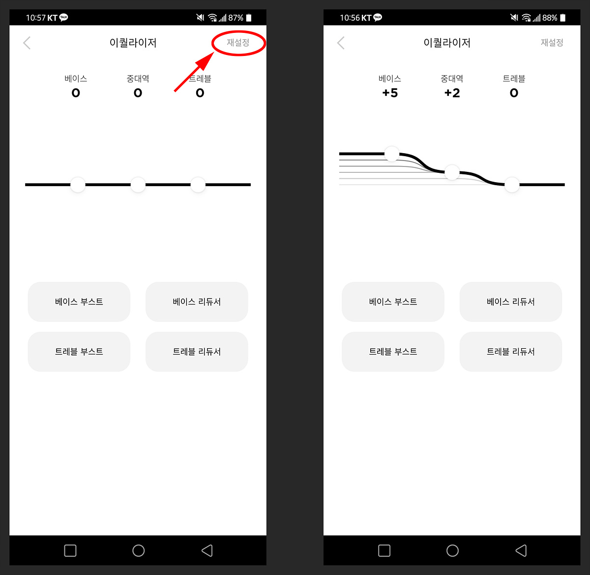 EQ는 4가지 모드가 있으며 재설정을 누르면 초기화됩니다. 각각의 모드나 초기화 상태에서 3 밴드로 사용자 EQ를 설정할 수 있는데 5 밴드만 넣어줬으면 더 좋았을 거 같네요. 기본 부스트나 리듀서 모드는 소리가 좀 극단적으로 바뀌는 경향이 있어서 사용자가 따로 조절하는 걸 추천합니다.