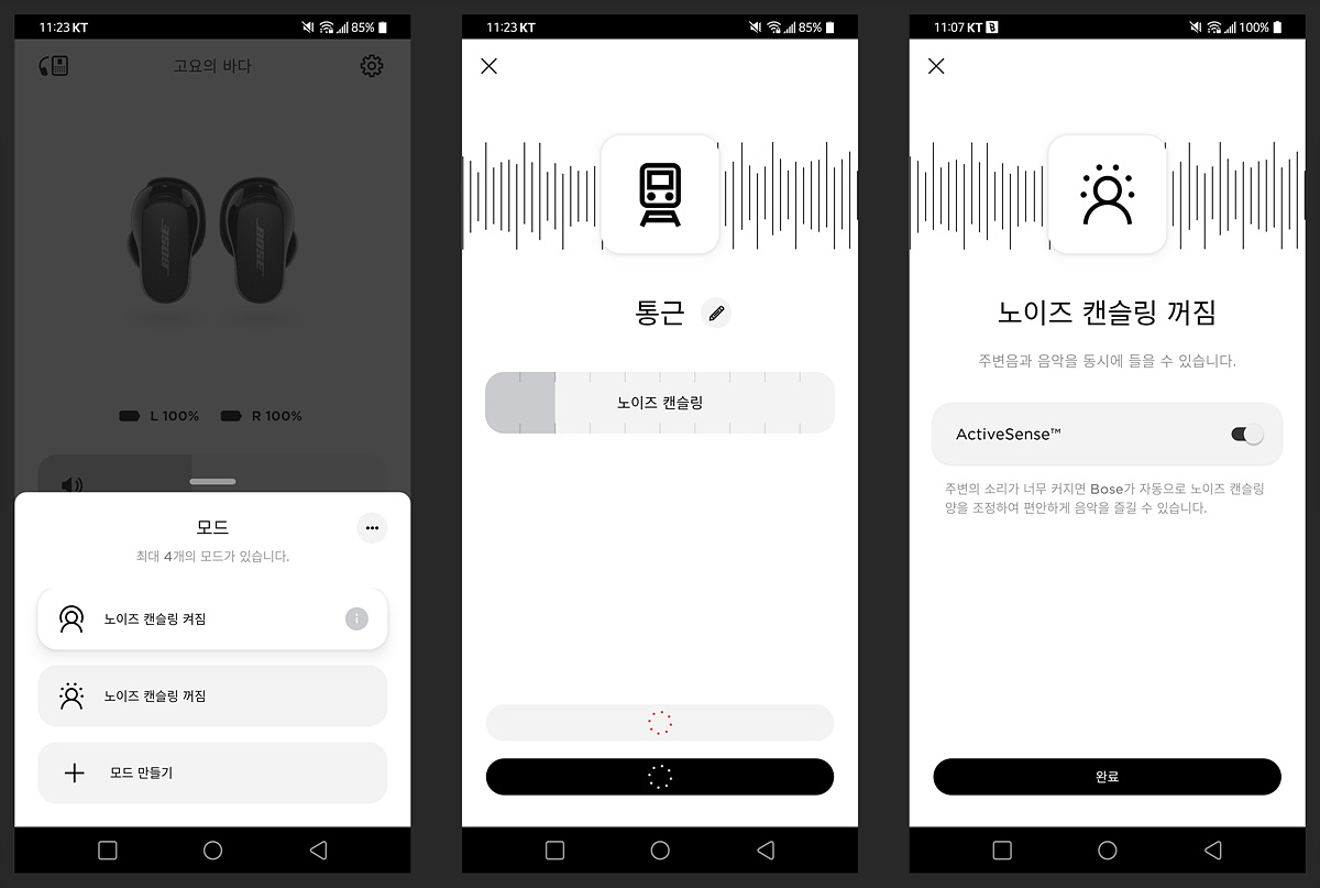 노이즈 캔슬링은 콰이어트(Quiet) / 어웨어(Aware) 모드로 동작을 하며 둘 중에 하나는 반드시 선택이 되어야 합니다. 모드를 바꿀 경우 음성 안내를 통해 현재의 상태를 확인할 수 있습니다. 모드를 만들어서 자신만의 상태를 따로 관리하거나 노이즈 캔슬링의 강도를 조절할 수 있으며 어웨어 모드에서는 ActiveSense™ 기능을 사용할 수 있습니다. 어웨어 모드의 경우 주변에서 갑작스럽게 큰 소음이 났을 때 불편할 수 있는데 액티브센스 기능은 이러한 소음을 완하해서 전달해줍니다. 처음에는 이런 기능이 있구나~~라고 생각을 했었는데 실제 사용해보니 상당히 쓸만하더군요.