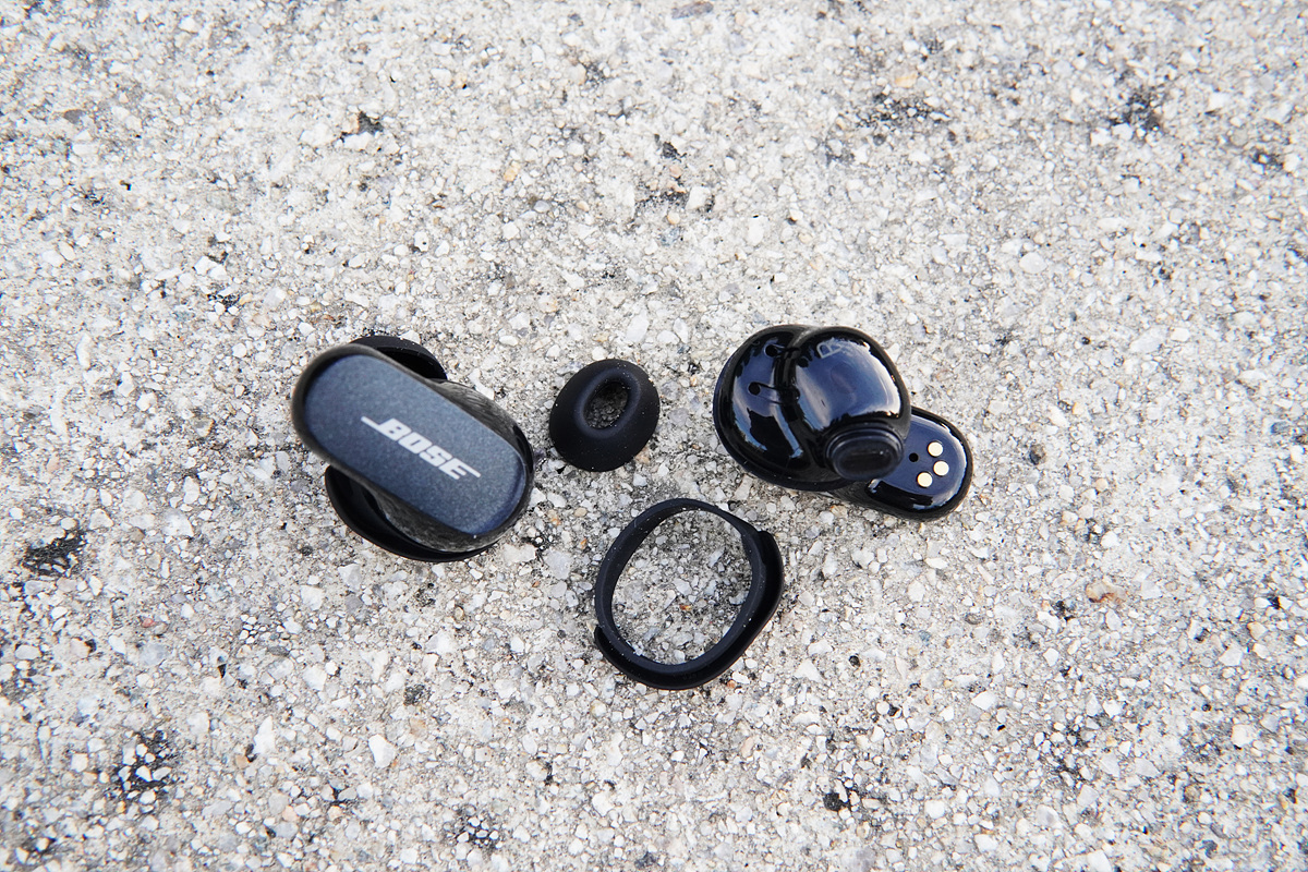 이어버드 한 개에 4개의 마이크가 있으며 이 중에서 두 개는 노이즈 캔슬링용으로 동작을 하게 됩니다. 마이크에는 별도의 윈드 실드(디플렉터)가 없어서 바람 소리가 좀 들어가는 편이지만 노캔 모드에서는 이 부분이 대부분 차단이 되어서 크게 신경 쓰이지는 않았습니다. 이어 팁은 타원형으로 되어있으며 Bose 핏은 모양에 따라 좌우 구분이 되어있으니 교체하거나 재 장착 시 방향을 잘 확인해서 사용하시기 바랍니다. 착용 감지 센서가 있어서 이어버드의 착용에 따라 재생이나 노캔 모드가 바로 작동하게 됩니다. (이 부분은 아래에서 다시 다루겠습니다.)