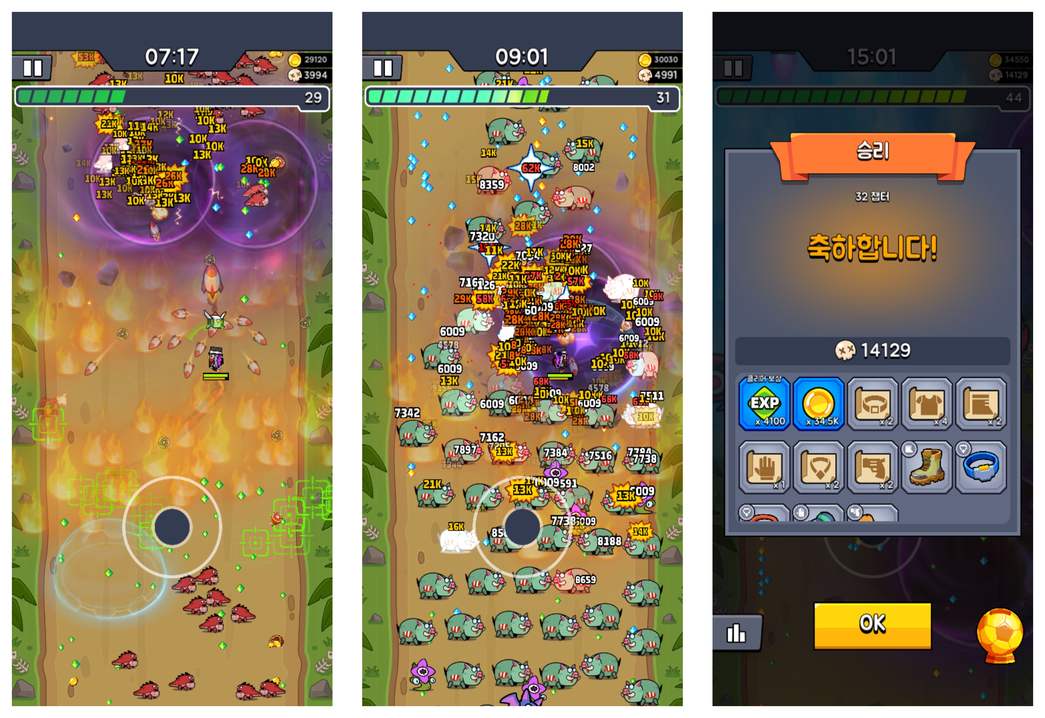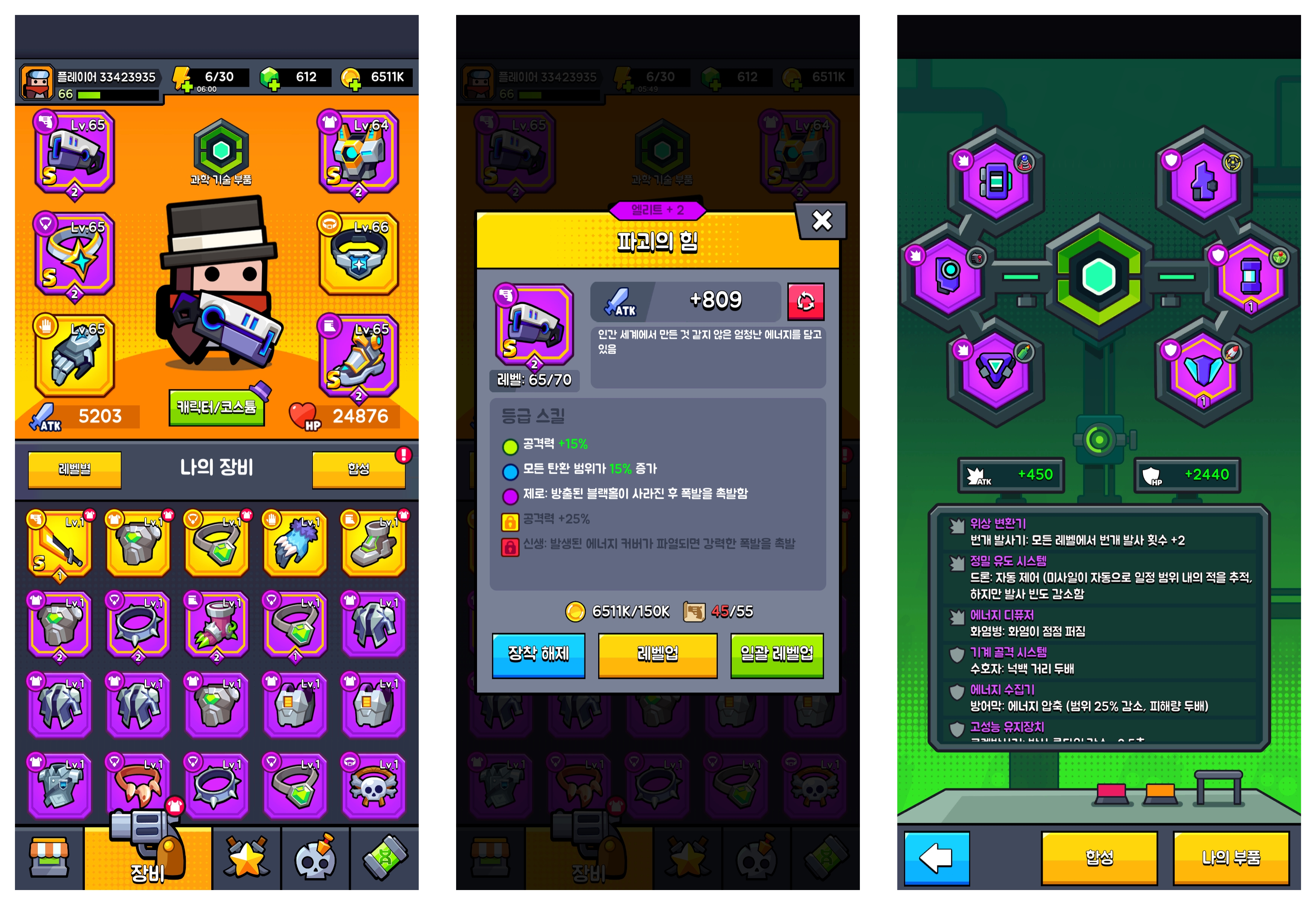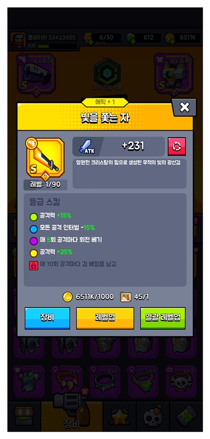 응? 노랑이 아니어도 돼지 나오는 단계에서는 훨~~씬 위력이 강하네요. 1주일넘게 막혀있는 32 챕터를 아주 쉽게 마무리했습니다. 앞으로도 챕터마다 무기를 바꿔가면서 깨야할 거 같습니다. 에픽을 넘어서 빨간 아이템은 대체 언제나 모을 수 있을지 갈길이 머네요. 추가로 과학 기술 부품도 모으기 정말 어렵네요. 현질을 하라는 건가?