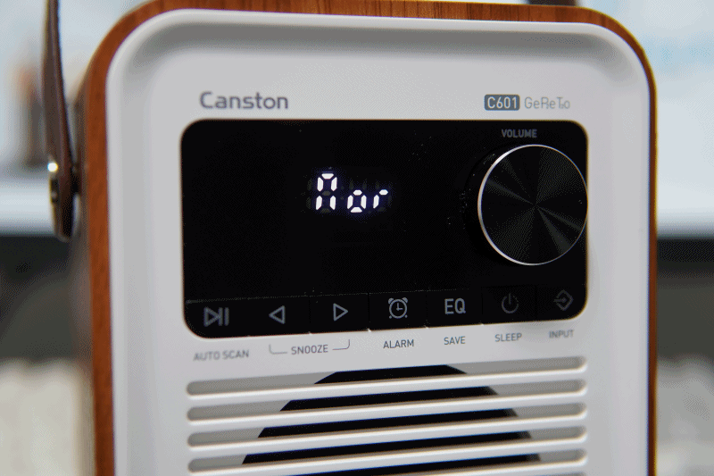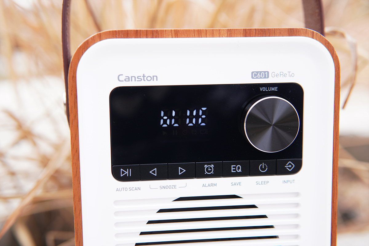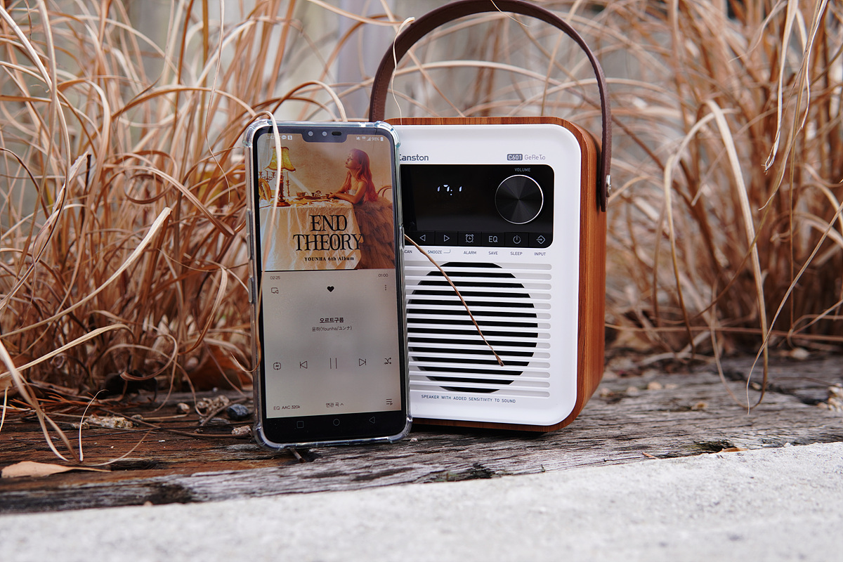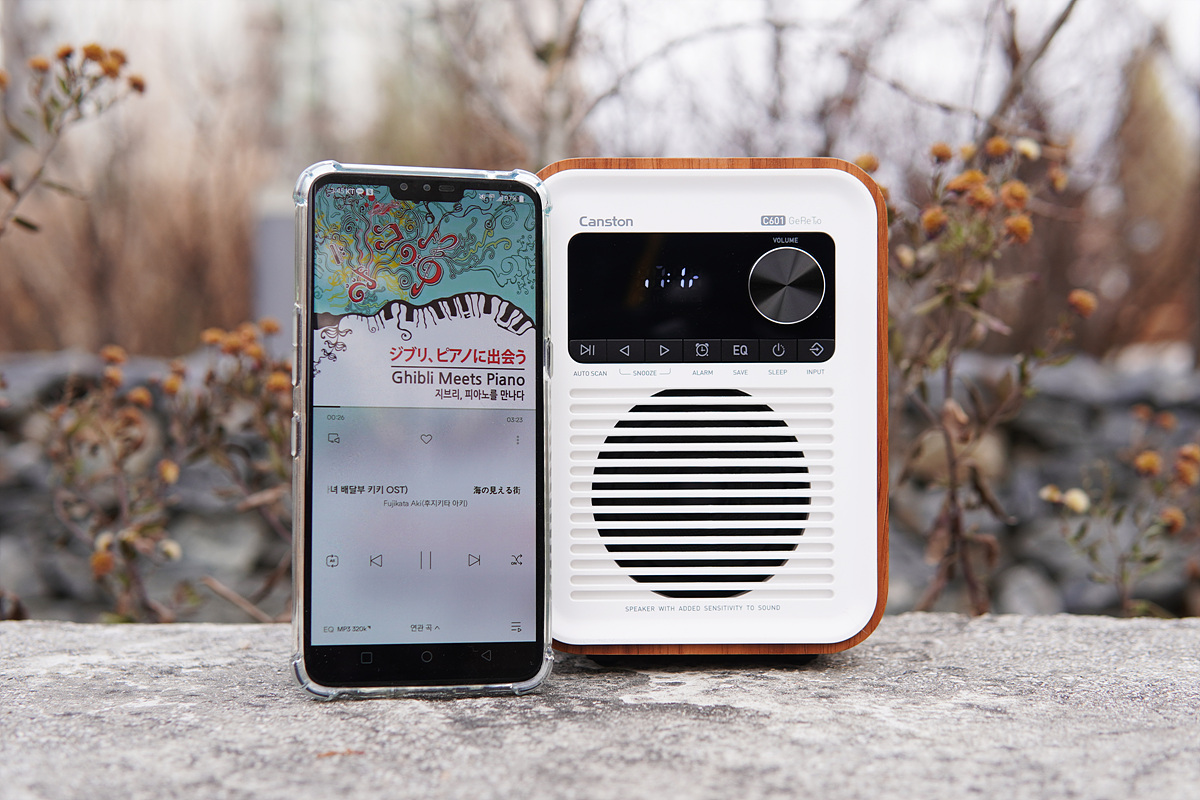 앞쪽의 디스플레이 화면으로 현재 모드와 라디오 주파수와 함께 시간(알람)을 확인할 수 있고 볼륨 조절 노브의 크기도 제법 큰 편이라 편리하게 조작할 수 있습니다. 화면 아래쪽으로는 재생과 시간, 그리고 입력 모드를 바꿀 수 있는 버튼이 배치되어 있습니다. 디스플레이 화면은 일정 시간 동안 조작이 없으면 자동으로 시간이 표시됩니다.