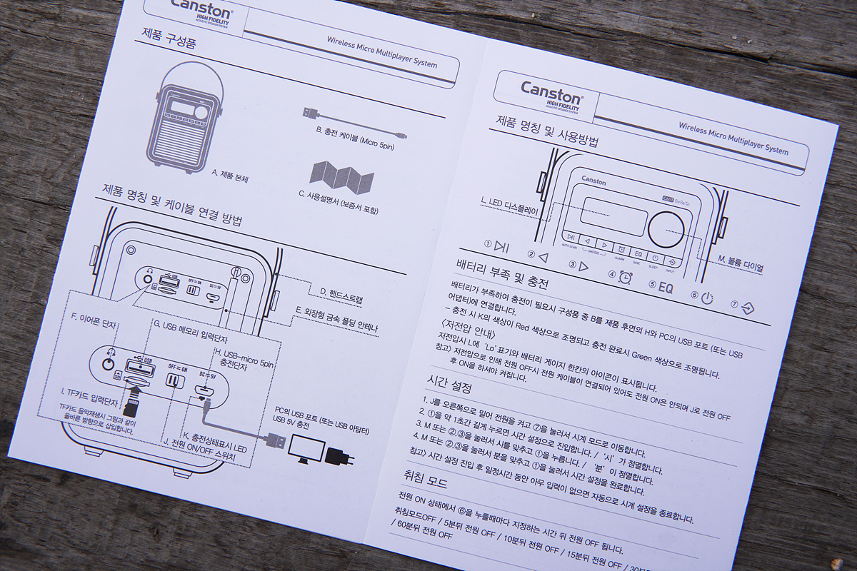 비슷한 가격대(10만 원 미만)의 제품들도 USB, TF 메모리를 사용할 수 있는 제품들은 많이 있지만 FM 라디오까지 사용할 수 있는 스피커는 많은 편은 아닙니다. 특히나 FM 라디오의 수신율을 높이기 위해 안테나를 내장한 스피커는 좀 더 적은 편이죠. 캔스톤의 블루투스 스피커 콘셉트가 모든 걸 다 넣은 올인원 제품을 추구하는 거 같습니다. 야외에서 듣는 라디오의 감성은 특유의 맛이 있죠. 이 제품의 또 다른 특징은 메모리에서 flac 파일까지 재생할 수 있다는 점입니다. 대부분의 스피커는 mp3만을 지원하는데 flac까지 재생할 수 있는 블루투스 스피커는 처음이라 살짝 놀랐습니다. 실제 제품의 외형, 기능과 소리는 어떨지 자세하게 살펴보도록 하겠습니다.