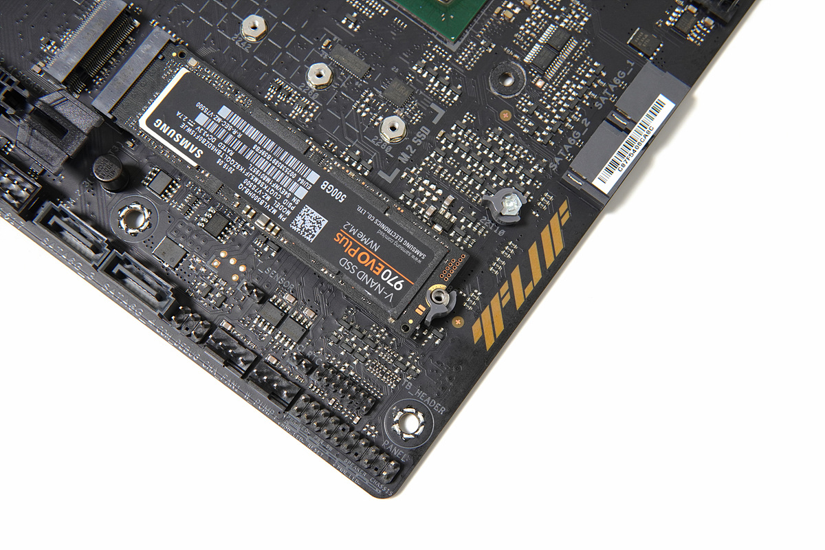 IO 패널까지 덮는 전원부 방열판도 그렇지만 TUF Gaming 로고가 있는 칩셋 방열판은 무게가 제법 나가서 확인을 해보니 두께가 제법 있는 편으로 칩셋의 온도를 관리하는데 좋은 편이었습니다.