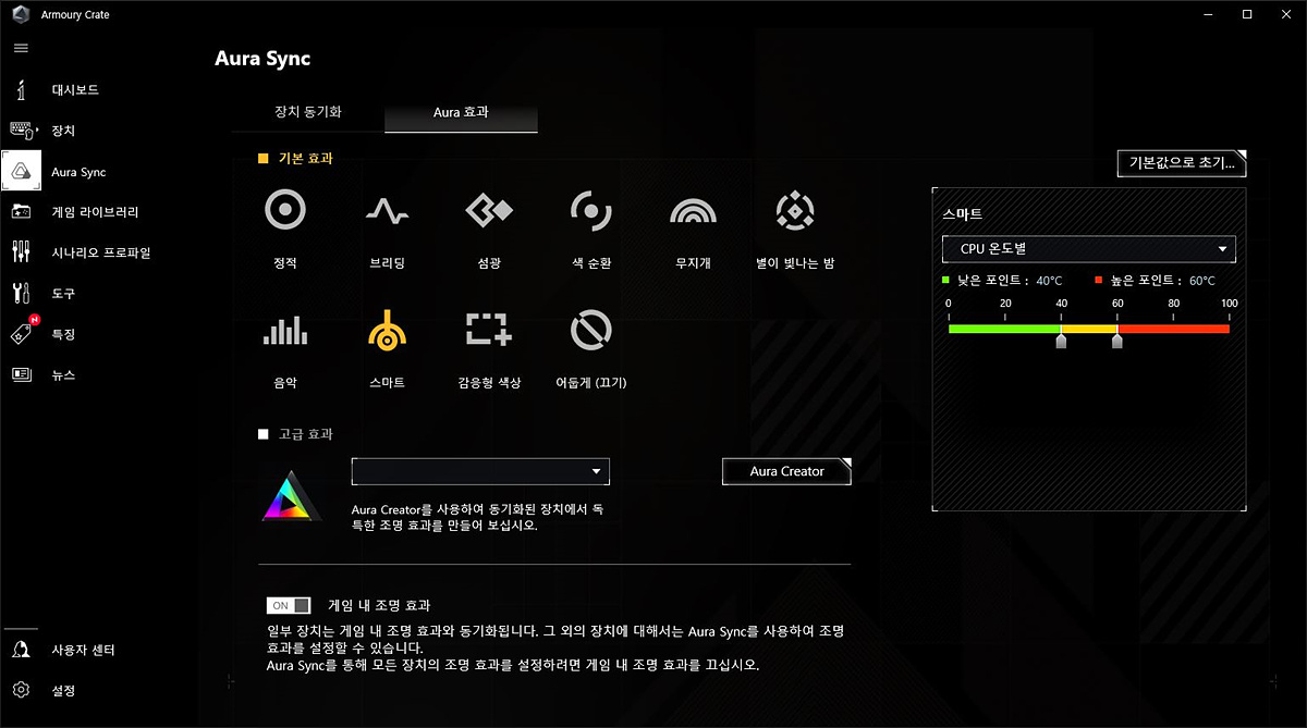 Aura Sync로 여러 가지 장치들의 RGB를 통합해서 지정할 수 있습니다.