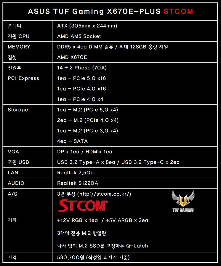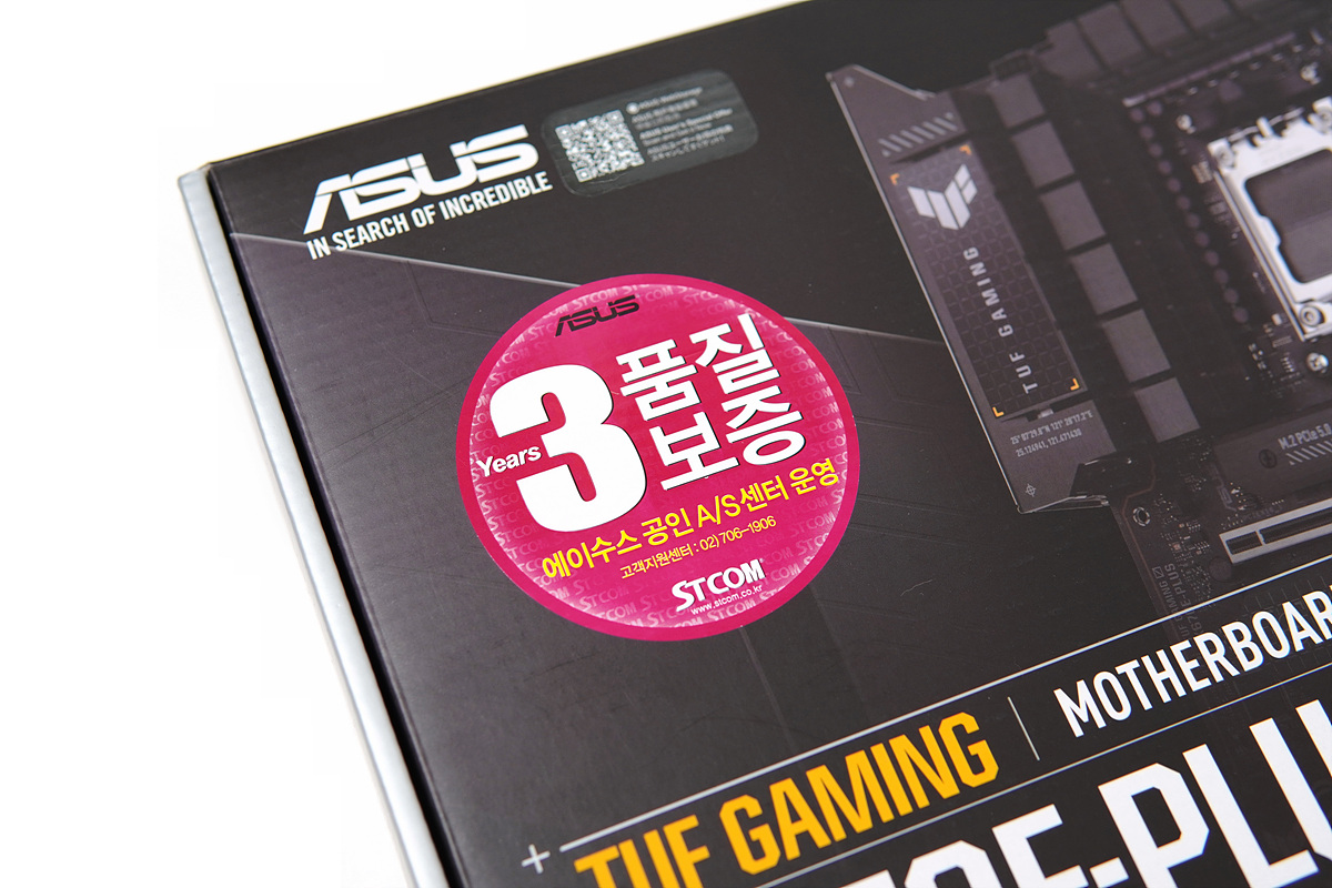 박스 디자인은 기존의 ASUS TUF 콘셉트를 그대로 유지하고 있으며 STCOM의 스티커가 부착되어 있습니다. 여러 가지 기능이 많다 보니 박스에는 스펙과 보드의 특징들이 자세하게 표시되어 있습니다.