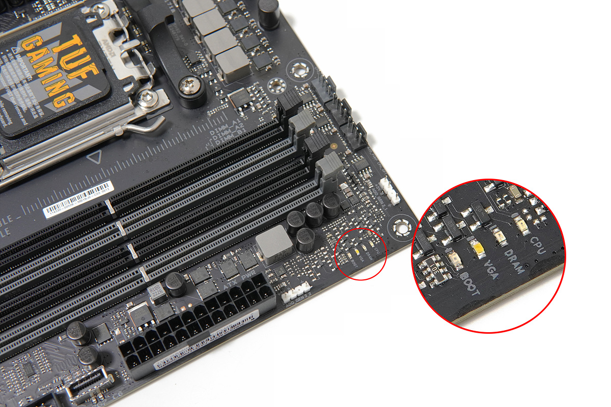 메모리 슬롯 위쪽으로는 CPU 쿨링에 필요한 쿨러, 펌프 소켓이 있으며 오른쪽에는 4개의 Q-LED가 있어서 시스템에 이상이 있을 때 문제점을 쉽고 빠르게 확인할 수 있습니다. +5V ARGB 핀 헤더는 위쪽에 두 개 아래에 한 개로 총 3개가 있으며 +12V RGB 핀 헤더는 보드 아래에 한 개가 있습니다.