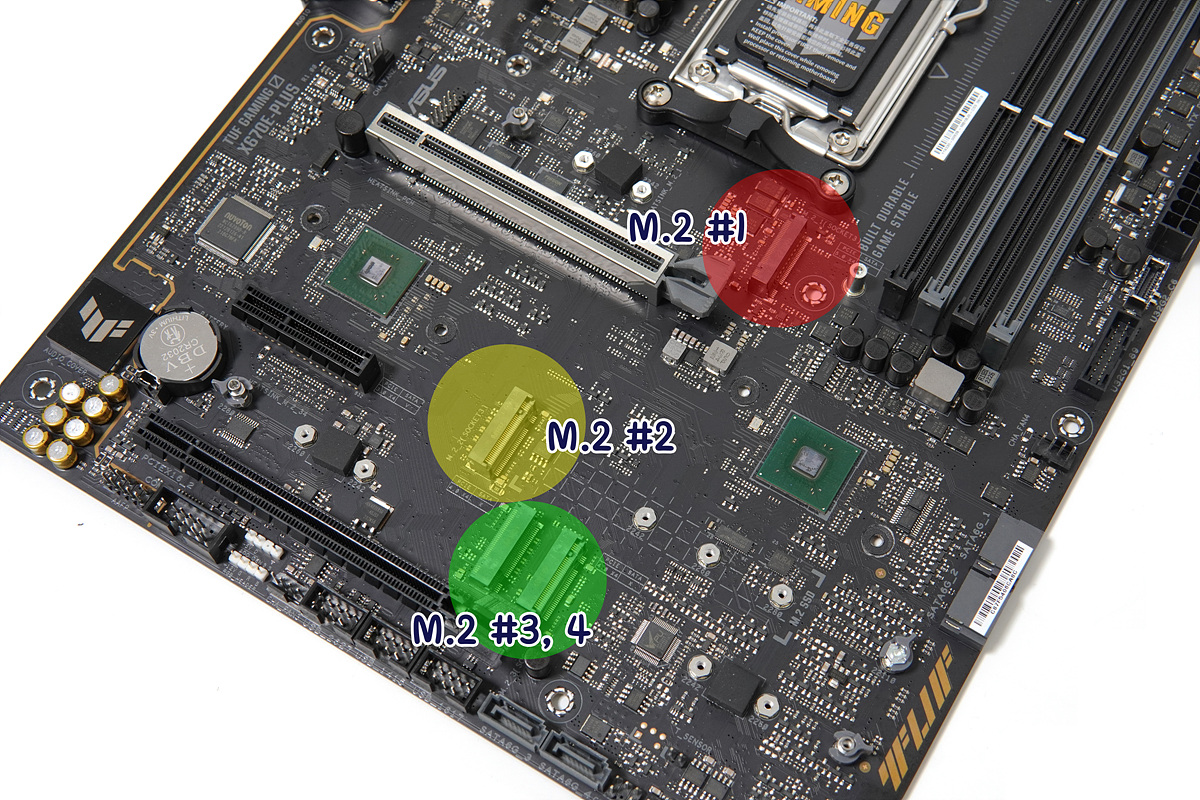 빨간색 1번 슬롯은 PCIe 5.0, 노란색인 2번은 PCIe 3.0, 초록색 3,4번 슬롯은 PCIe 4.0을 지원하고 있으며 NVMe SSD만 사용할 수 있습니다. (M.2 SATA 사용 불가) 별도의 방열판이 없는 #2 슬롯은 22110 M.2 SSD를 장착할 수 있으며 나머지는 2280까지 지원합니다.