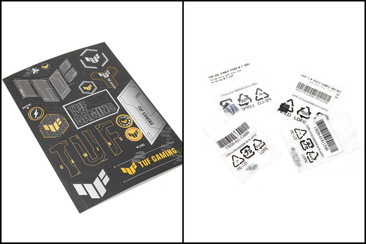 이제는 하드웨어를 선택할 때 단순히 스펙과 기능으로만 선택하는 게 아닌 특유의 감성도 크게 한 몫을 하고 있죠. 이런 감성을 채워주는 TUF 스티커도 포함이 되어있으며 M.2 SSD 설치를 위한 높이 조절용 패드와 고정 나사가 포함되어 있습니다. 아래에서 다시 소개를 하겠지만 ASUS 보드에서는 나사 없이 M.2 SSD를 고정할 수 있는 Q-Latch 기능이 있어서 빠르고 편리하게 SSD를 고정할 수 있습니다. SSD를 추가하거나 교체할 때 M.2 나사를 떨어트리는 경우가 간혹 있는데 이런 상황을 막을 수 있습니다. ^^