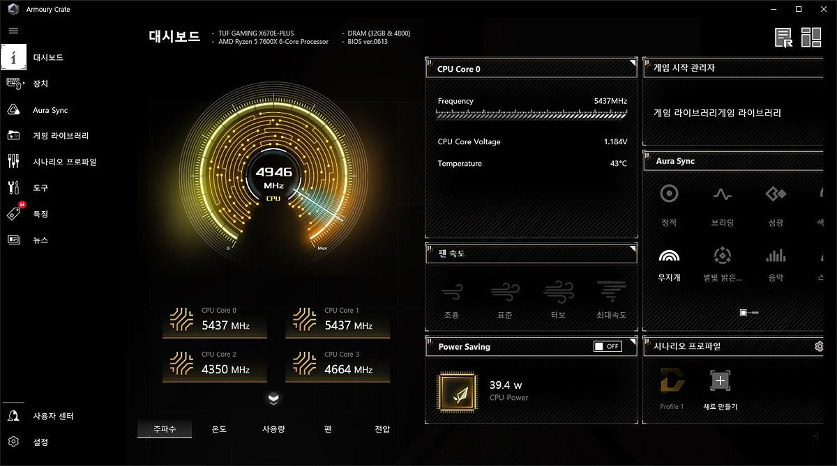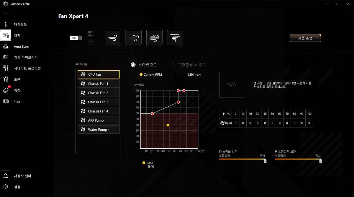 대시보드에서는 시스템의 간단한 정보를 확인할 수 있으며 Fan Xpert에서는 지정된 상태로 쿨링을 설정할 수 있습니다. 바이오스에서 할 수도 있지만 윈도우에서 하는 게 조금 더 쉽고 편리합니다.