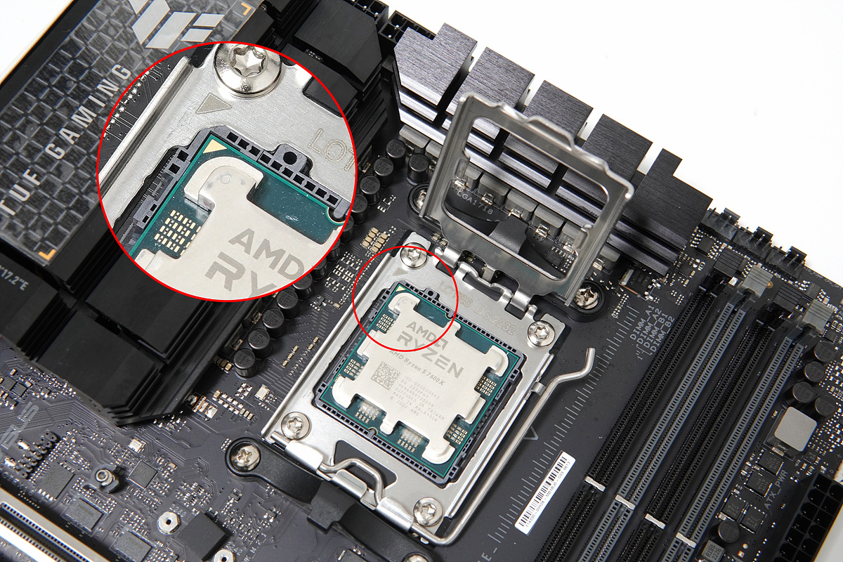 이번 AM5부터는 인텔과 같은 방식인 LGA 방식으로 바뀌어서 CPU 핀이 아닌 보드의 핀이 휘지 않도록 조심해서 장착을 해야 합니다. 장착할 때는 방향에 주의하세요.