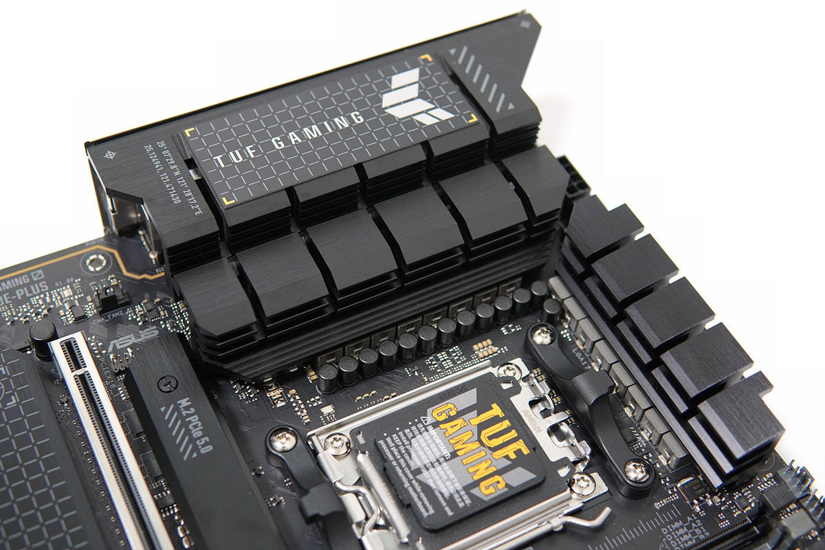 IO 패널까지 덮는 전원부 방열판도 그렇지만 TUF Gaming 로고가 있는 칩셋 방열판은 무게가 제법 나가서 확인을 해보니 두께가 제법 있는 편으로 칩셋의 온도를 관리하는데 좋은 편이었습니다.