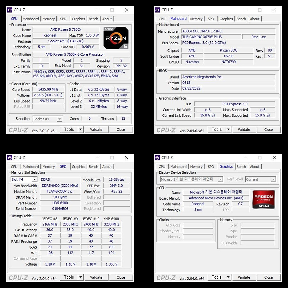 CPU-Z를 통해서 라이젠 5 7600X 라파엘과 메인보드의 정보를 확인할 수 있습니다.