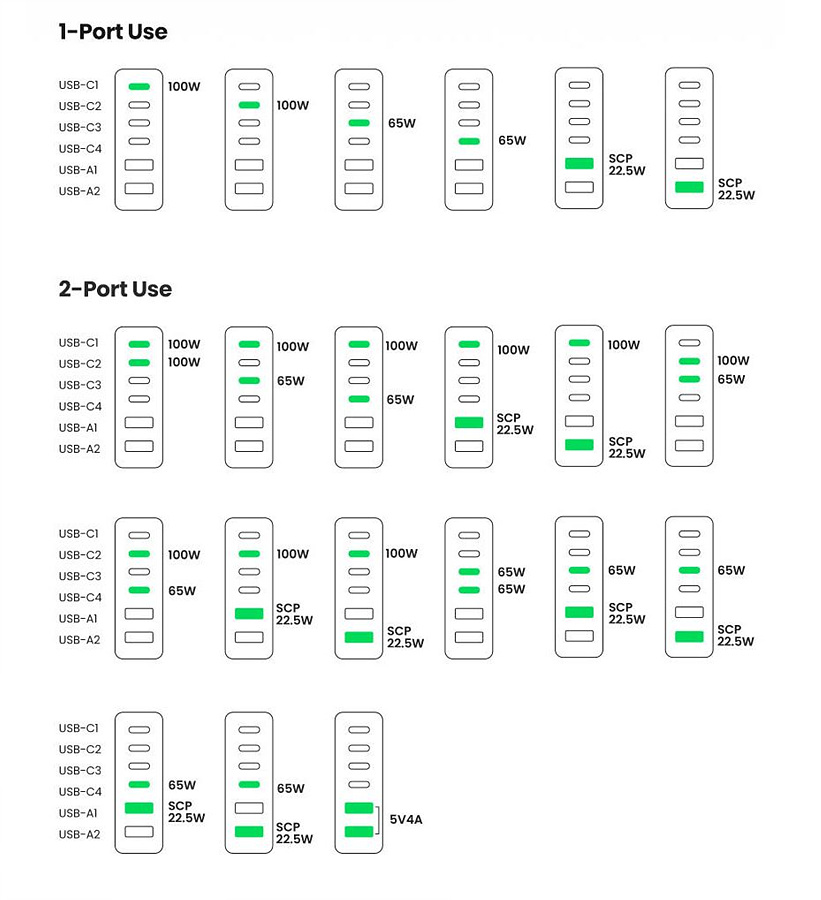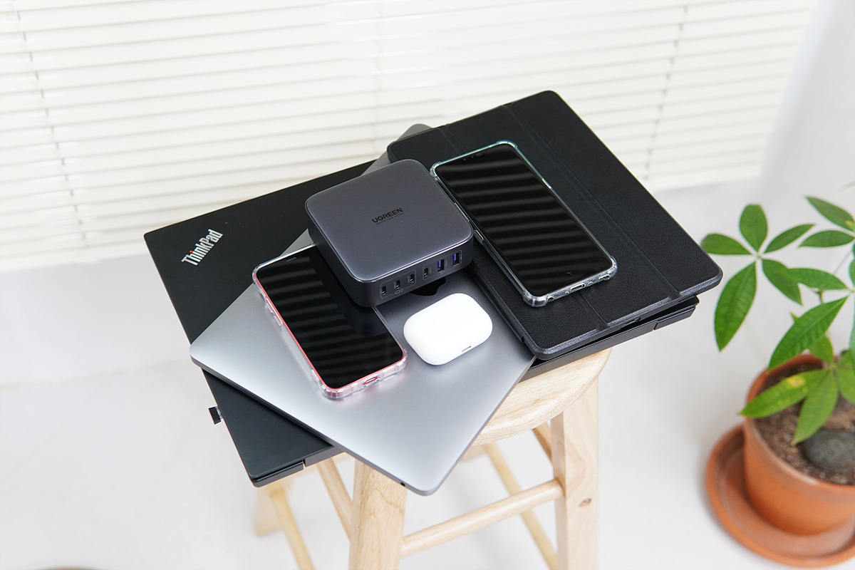 충전되는 방식이나 포트 그리고 출력이 점차 다양해지고 높아지다 보니 이를 활용하는 멀티 충전기를 선택할 때는 점점 확인해야 할 부분들이 많아지고 있습니다. 특히나 여러 가지 기기를 동시에 연결(충전) 해도 높은 출력을 유지할 수 있는 포트는 꼭 필요한데 유그린 200W 멀티 충전기의 경우 모든 포트를 사용하더라도 65W의 출력으로 대부분의 노트북에서 사용할 수 있습니다. C1, C2 포트를 이용해서 단독으로 충전하거나 두 대만을 충전한다면 100W + 100W 출력으로 최고 사양의 노트북이나 애플의 맥북에서도 충분히 빠른 속도로 충전을 할 수 있습니다.