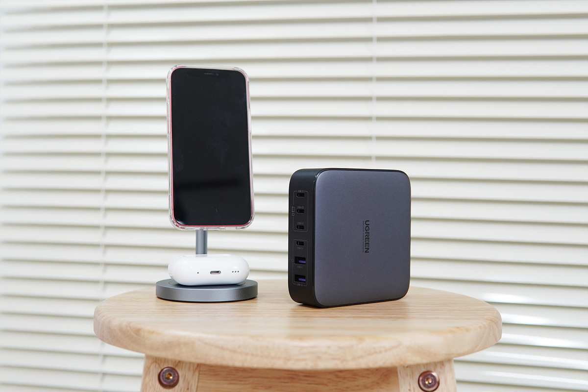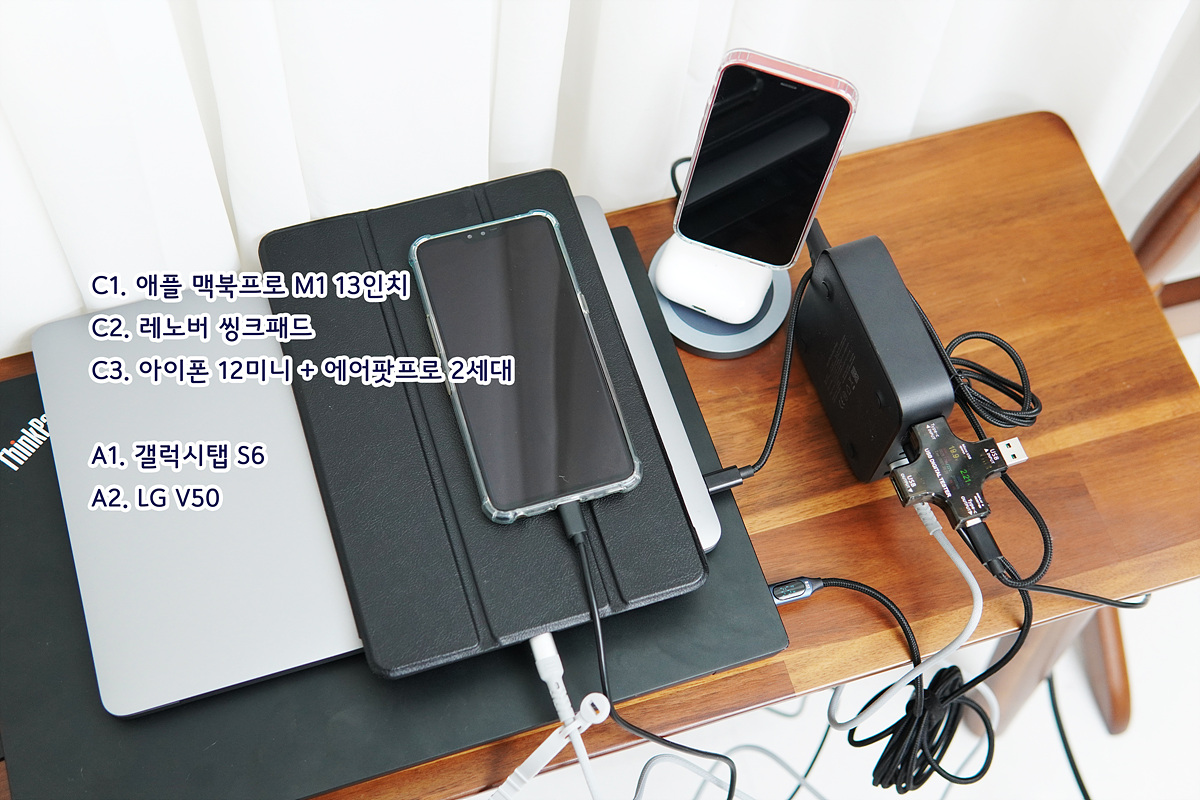 충전기 테스트에는 5개 포트를 동시에 사용했으며 아이폰 12 미니 + 에어팟프로 2세대는 별도의 무선 충전기를 사용했습니다. 충전에는 충전기 자체의 출력도 중요하지만 연결하는 케이블 역시 60W / 100W 규격이 있으니 이를 꼭 확인한 뒤 사용하시기 바랍니다.