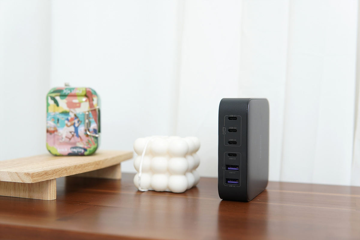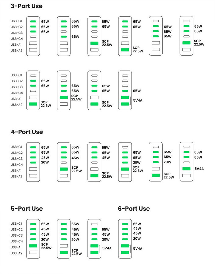 총 6개의 포트가 있으며 연결되는 포트의 개수에 따라서 출력이 가변형으로 조절이 되는 방식입니다. 6개 전체를 모두 사용하더라도 여유롭게 사용할 수 있습니다.
