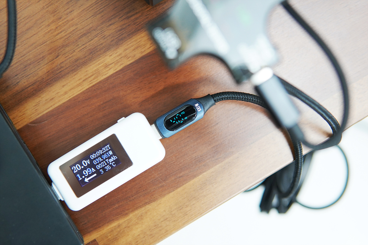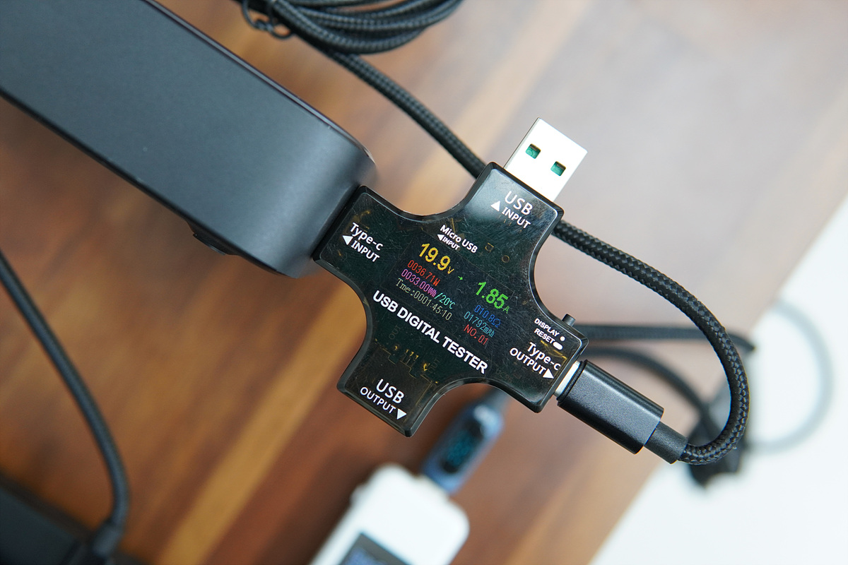 C2 포트의 씽크패드 노트북 역시 38W ~ 42W로 꾸준한 출력을 유지했습니다. 혹시 몰라서 케이블과 테스터기를 같이 연결했는데 다행히 두 기기의 수치가 모두 같게 나오네요.