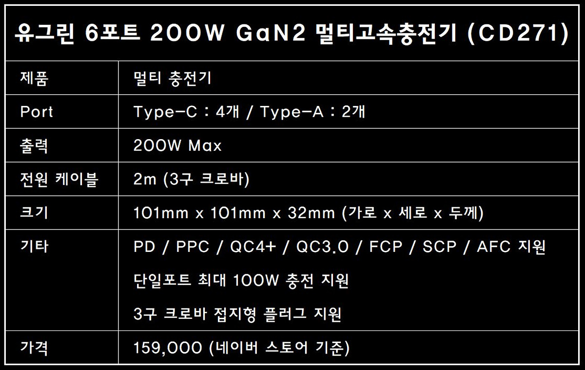 유그린 6포트 200W GaN2 PD PPS 멀티고속충전기, CD271 : 유그린샵