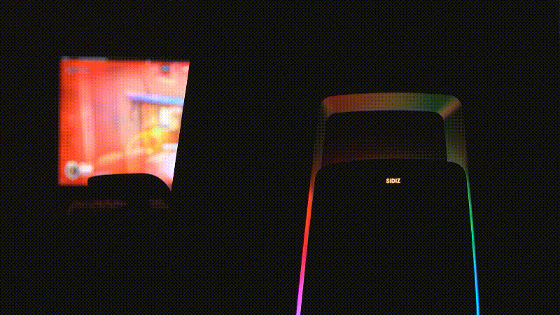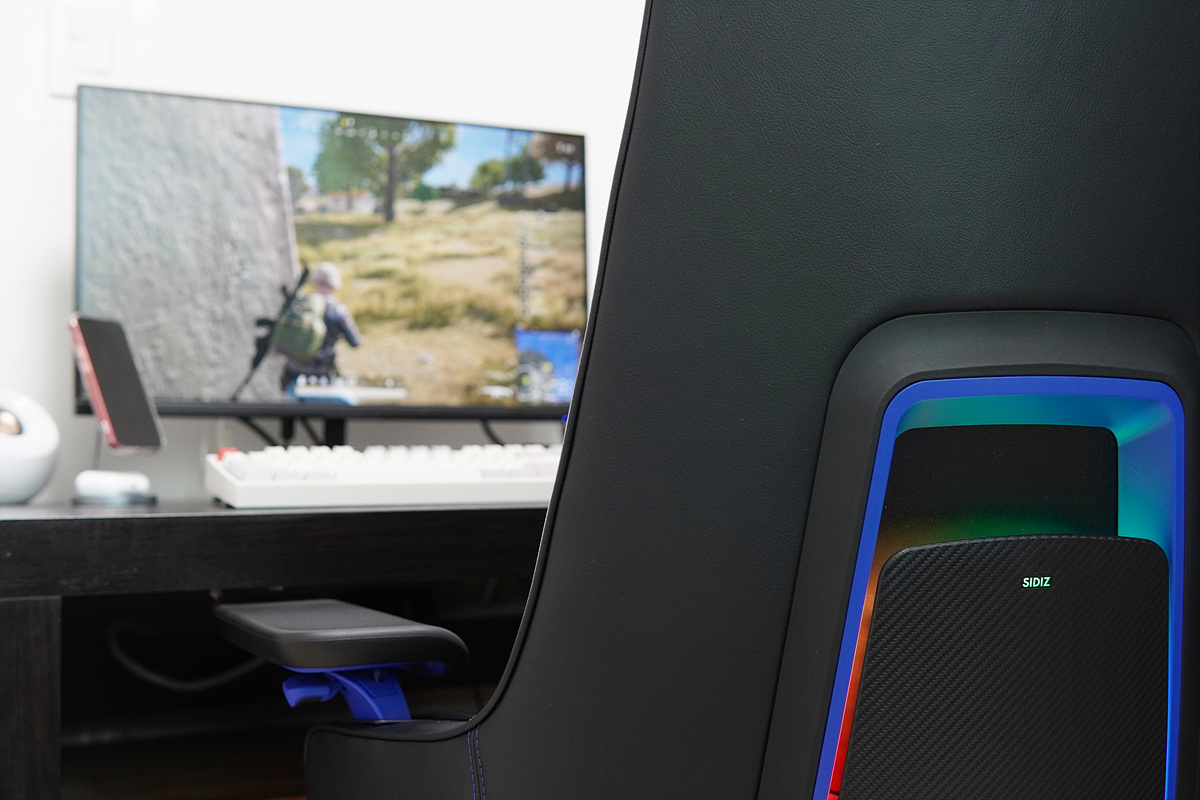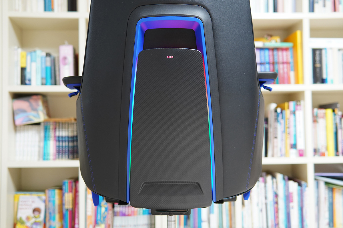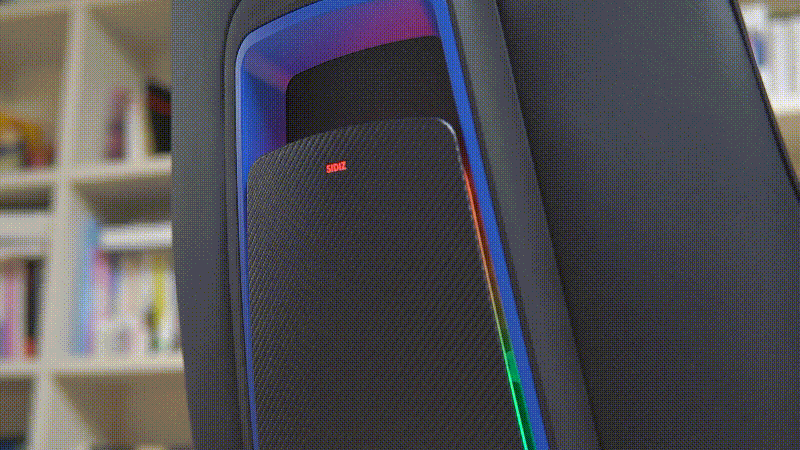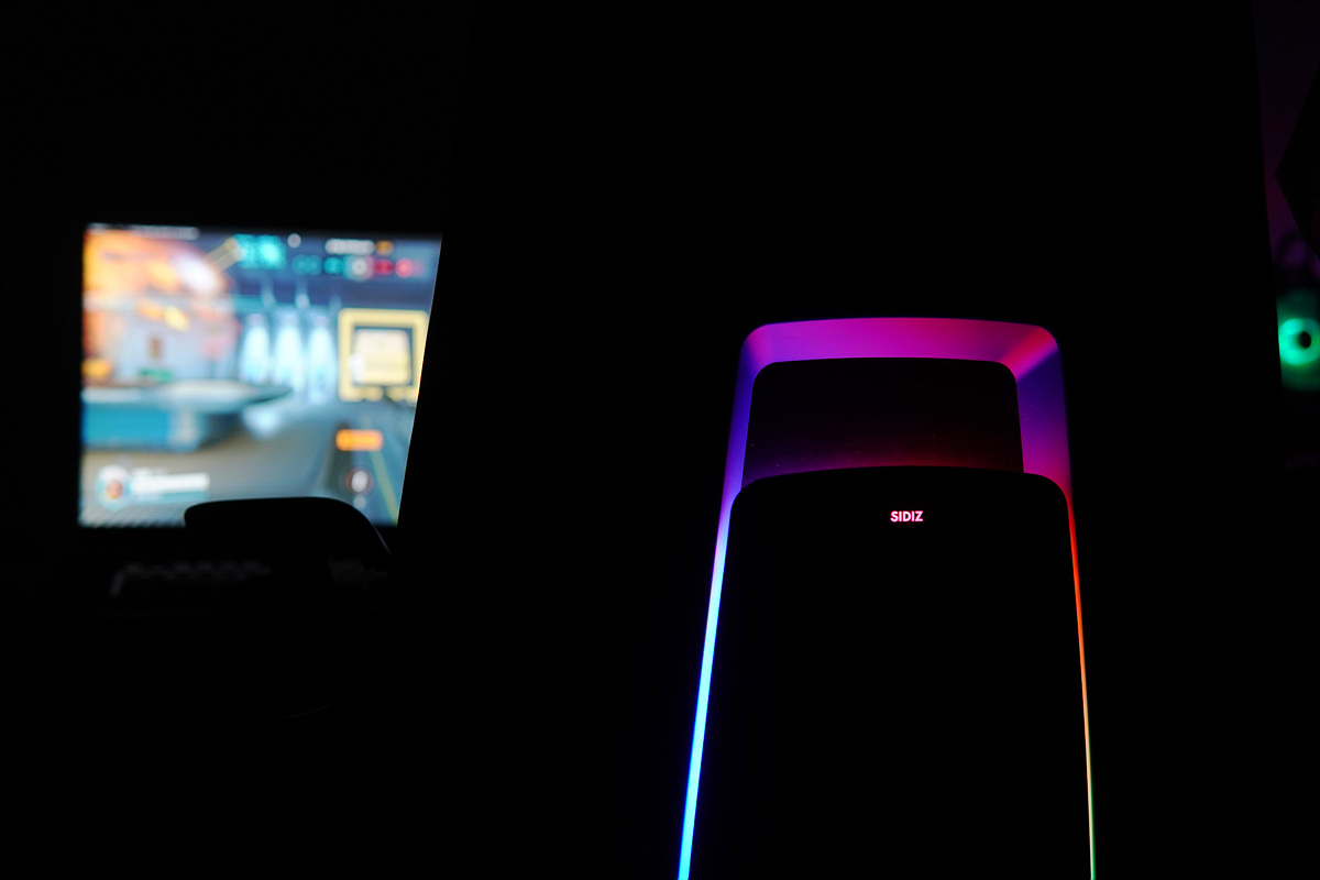 등판 쪽에는 RGB LED가 켜지게 되며 밝기 역시 좋아서 불을 켠 상태에서도 LED 효과를 확인할 수 있으며 RGB 모드 역시 터치 방식으로 조절할 수 있습니다. 터치는 SIDIZ 로고가 아니라 로고 아랫부분을 터치해야 조절할 수 있으며 짧게 터치하면 모드가 바뀌고 3초 정도 누르고 있으면 LED를 켜고 끌 수 있습니다.