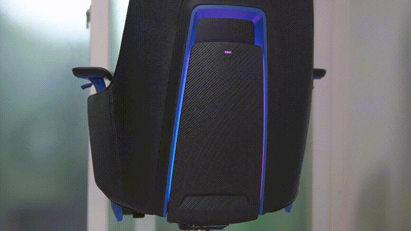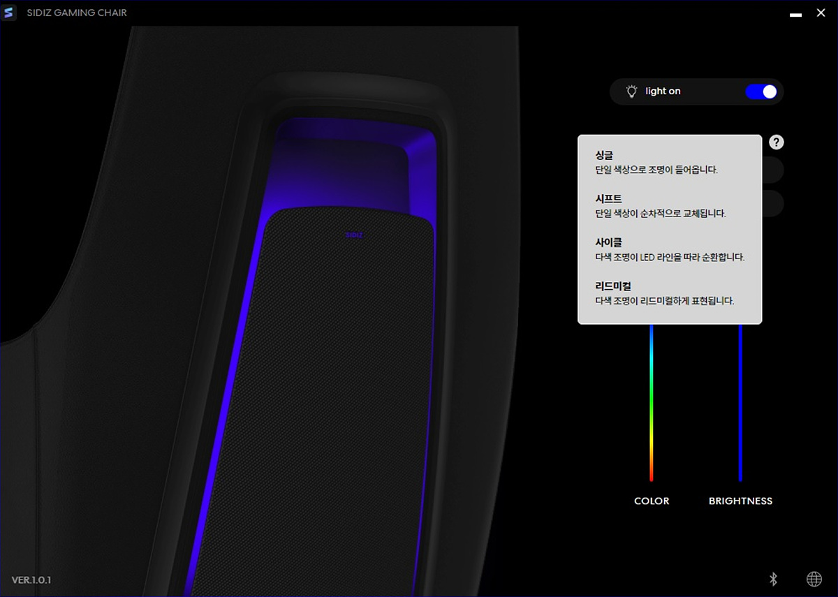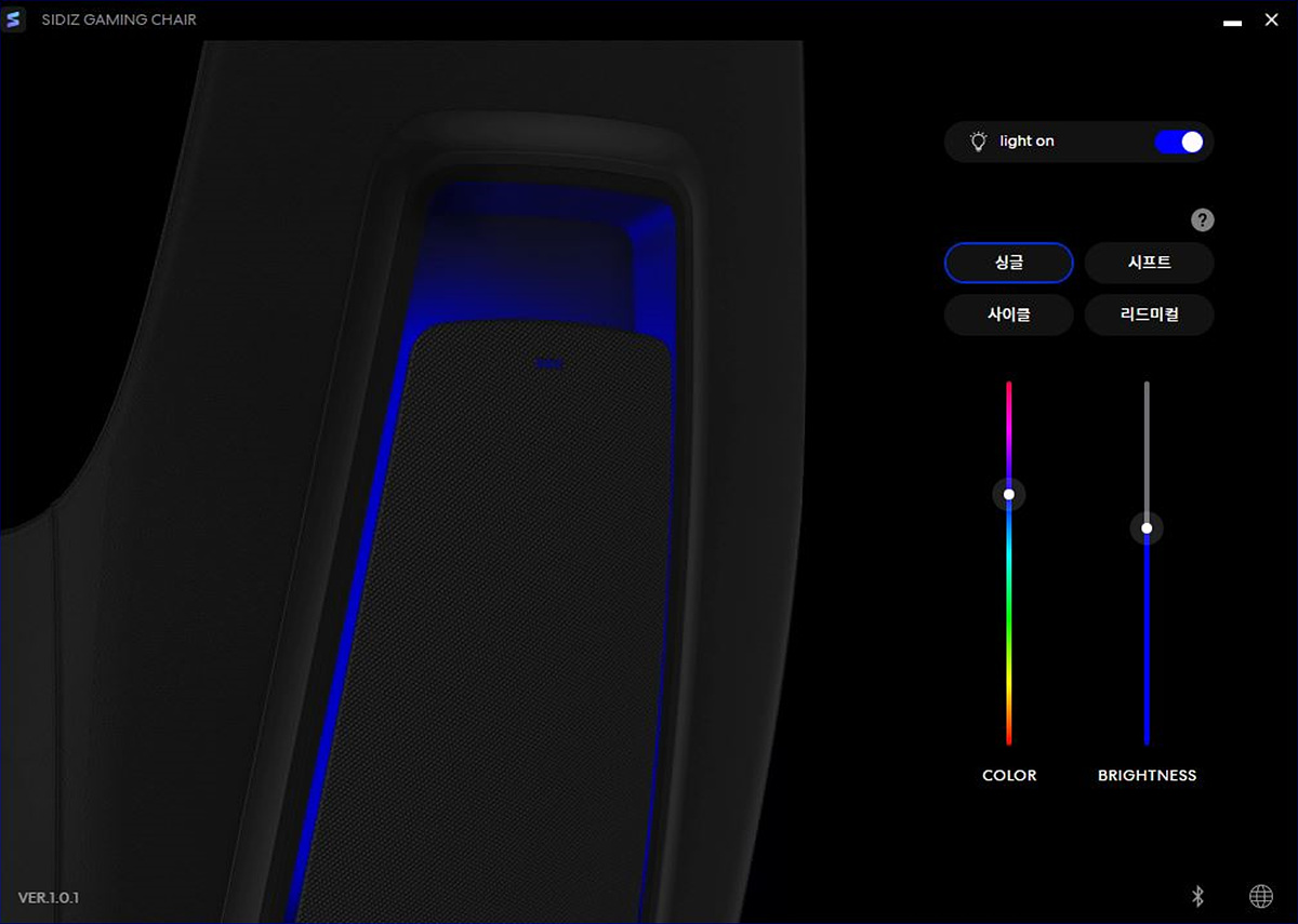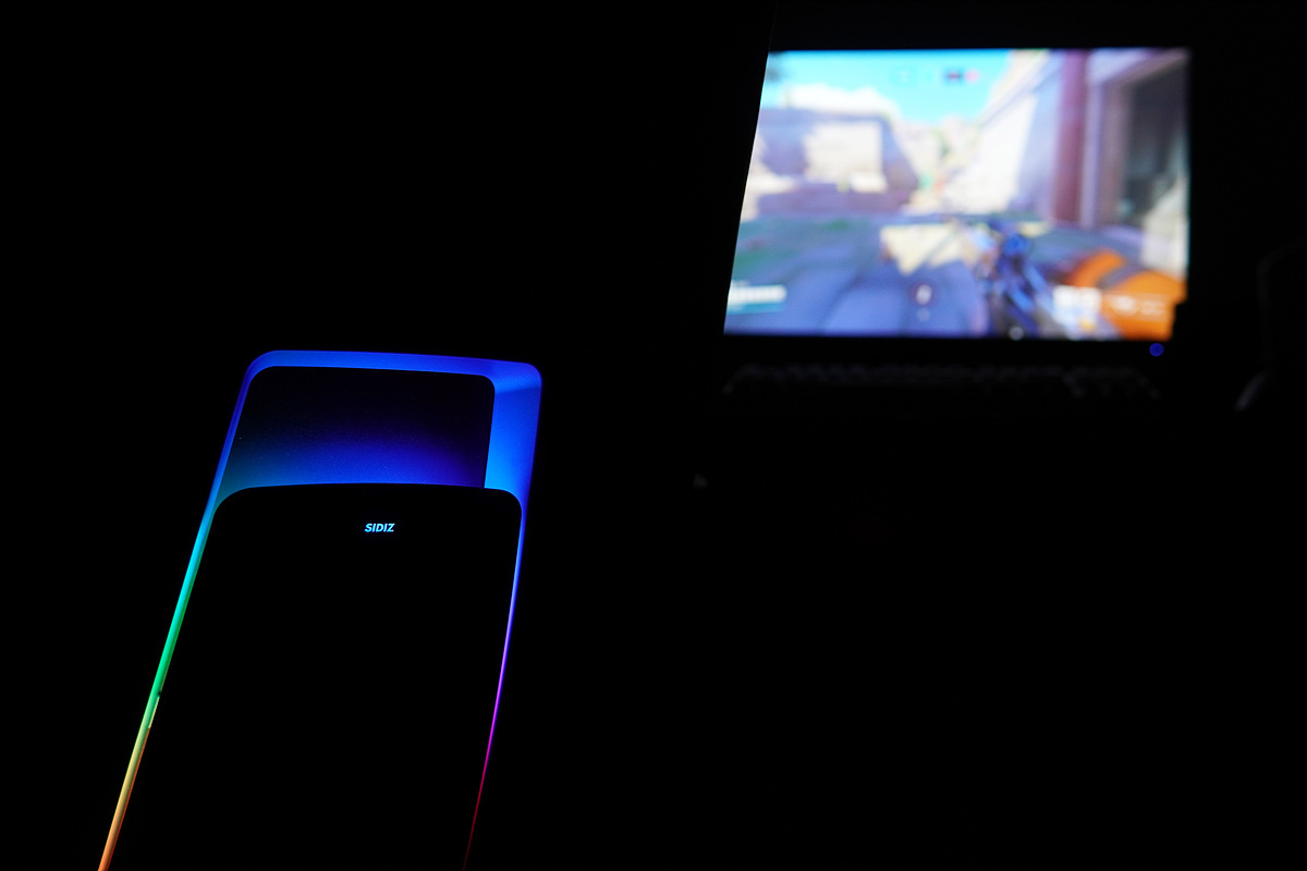 등판 쪽에는 RGB LED가 켜지게 되며 밝기 역시 좋아서 불을 켠 상태에서도 LED 효과를 확인할 수 있으며 RGB 모드 역시 터치 방식으로 조절할 수 있습니다. 터치는 SIDIZ 로고가 아니라 로고 아랫부분을 터치해야 조절할 수 있으며 짧게 터치하면 모드가 바뀌고 3초 정도 누르고 있으면 LED를 켜고 끌 수 있습니다.