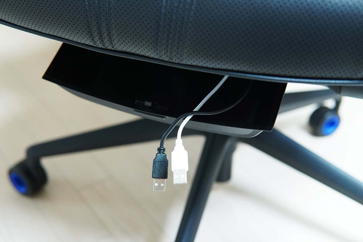 의자에 RGB LED와 쿨러가 사용되었다는 이야기를 듣고 전원은 어떻게 해결했지?라는 궁금증이 제일 먼저 들었습니다. AC 전원이나 어댑터를 연결하는 건 너무 불편할 테니 충전식 배터리가 있을 거라 생각했는데 제 예상과는 다르게 생활에서 자주 이용하는 보조 배터리로 해결을 했더군요. 내장 배터리의 경우 무게와 함께 복잡해지는 구조를 생각해 보면 간편하게 교체할 수 있는 보조 배터리를 사용한 건 좋은 선택이었다고 생각합니다. 하지만 보조 배터리가 기본 구성품에 포함되지 않았다는 건 많이 아쉬웠습니다. GC PRO의 가격은 80만 원 후반으로 다른 의자들과 비교해서 가격이 좀 나가는 편이라 구입하는 사용자들 역시 이런 부분을 기대하고 있을 텐데 말이죠. 그런 분들을 위해 시디즈에서는 GC PRO를 구매하면 보조배터리를 증정하는 대리점 구매 프로모션을 종종 준비하여 진행한다고 하니 시디즈 소식을 계속 살펴보면 좋겠죠.