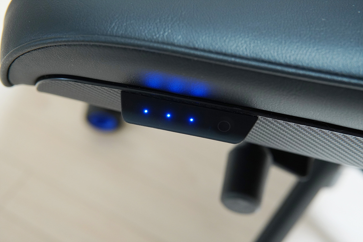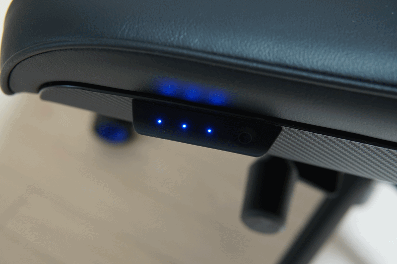 보조 배터리를 연결하면 왼쪽 측면의 리모컨으로 좌판의 쿨링 시트를 3단계로 조절할 수 있습니다. 쿨러의 동작은 터치 방식으로 터치 감도는 상당히 좋은 편이었습니다.