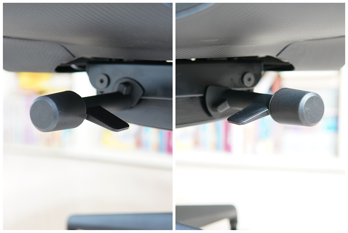 왼쪽 레버 - 좌판 깊이 조절 / 오른쪽 레버 - 높이 조절
