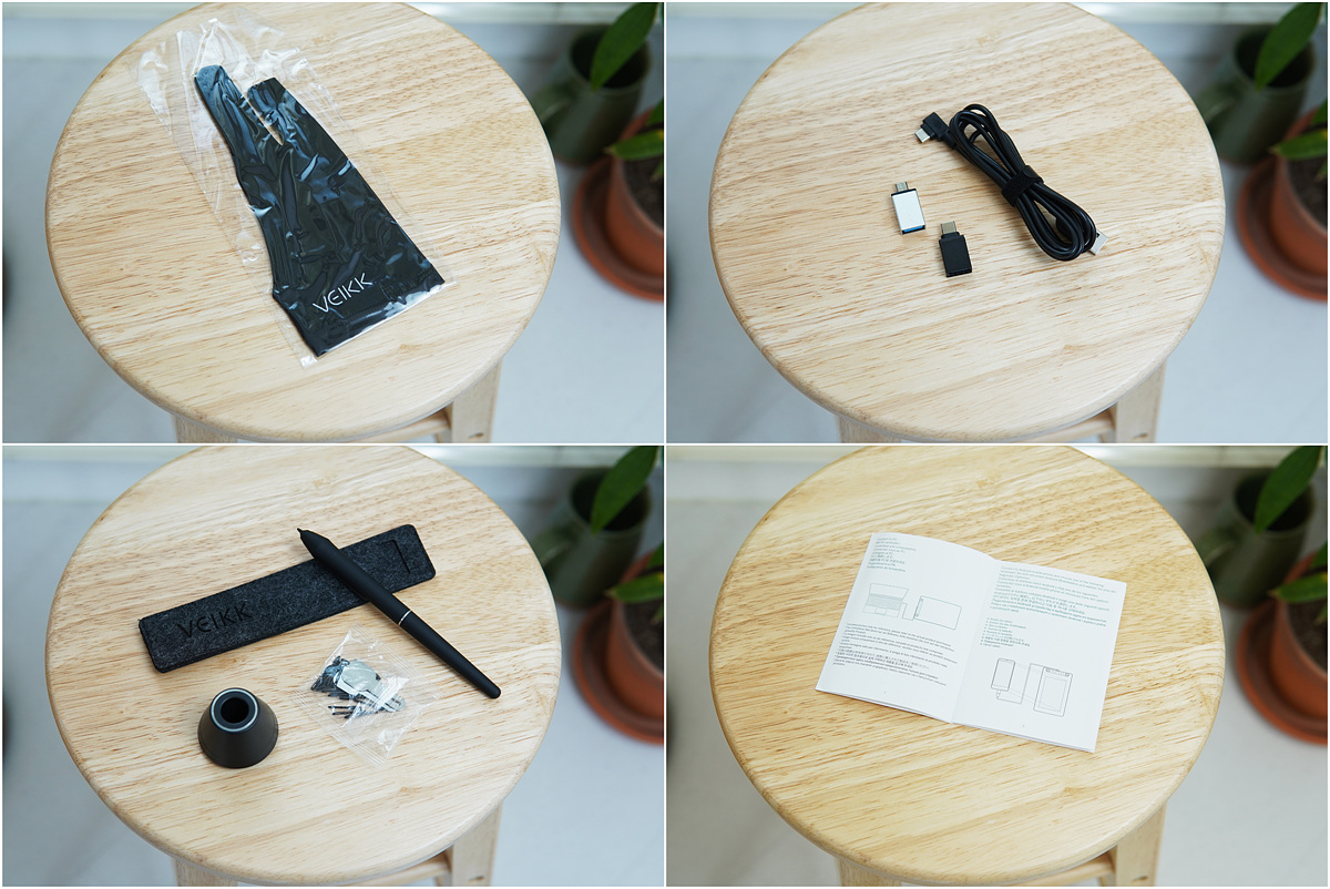 구성품은 드로잉 장갑, USB 케이블, OTG 젠더(Type-c, micro 5핀), 펜, 추가 펜팁, 거치대와 설명서로 이루어져 있습니다. 구성품은 박스 안쪽에 있으니 꼭 확인해 보세요. ^^