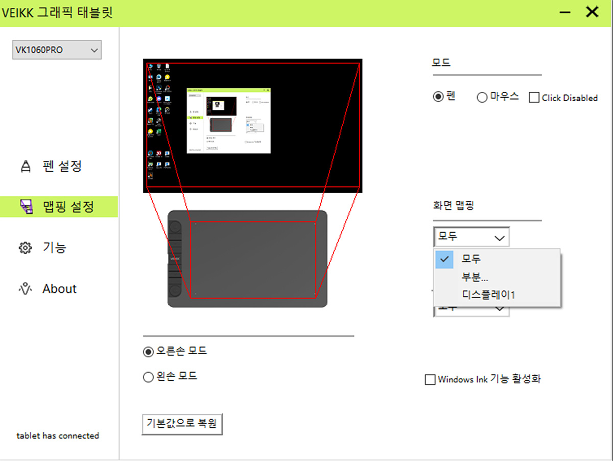 작업 영역 설정과 함께 타블렛을 오른손 / 왼손 모드로 바꿀 수 있습니다.