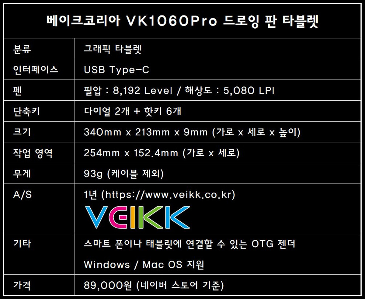 베이크코리아 VK1060Pro 타블렛 역시 입문자들부터 숙련자들까지 모두 사용할 수 있을만한 스펙과 함께 넓은 크기와 두 개의 퀵 다이얼로 편의성을 높인 제품입니다. 가벼운 무게의 펜 홀더와 별도의 번들 소프트웨어를 제공하지 않는 부분은 아쉽게 느껴졌지만 89,000원의 가격을 생각한다면 어느 정도 이해가 되는 부분이었습니다. USB 케이블이나 기본 드라이버(S/W)쪽만 개선이 된다면 가성비는 더더욱 높아질거라 생각됩니다.