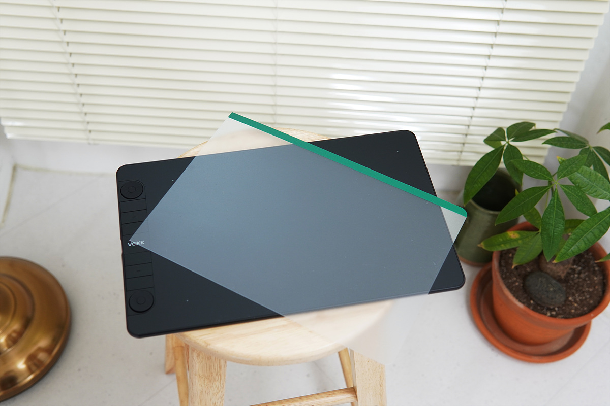 보호 필름은 사진처럼 부착할 수 있으며 초록색 영역이 타블렛과 접착이 되므로 필름 용도와 함께 보호를 하는 커버(Cover)의 역할도 할 수 있습니다.