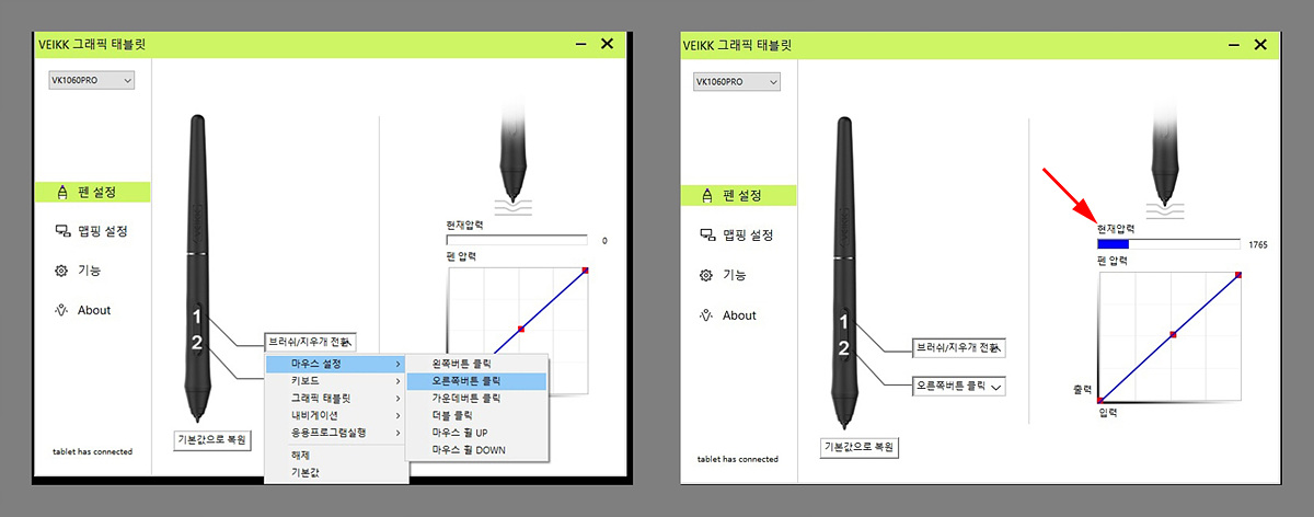 펜 설정에서는 앞쪽 두 개의 버튼을 임의로 지정할 수 있으며 펜 팁을 타블릿에 누르면 현재 입력값을 확인할 수 있으니 이 값을 토대로 펜 압력을 조절해서 사용하시기 바랍니다.