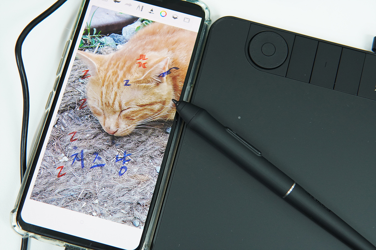 OTG 젠더를 사용하면 스마트폰이나 패드에서도 바로 사용할 수 있습니다. 스마트기기에 연결할 때는 작업 영역도 같은 방향으로 지정되므로 타블렛도 세로로 사용하는 게 좋습니다. OTG 젠더를 포함한 건 좋은데 반대로 기본 케이블을 Type-C로 하고 C to A 젠더 하나만 포함하는 편이 좀 더 좋았을 거 같은데 이 부분도 좀 아쉽더군요.