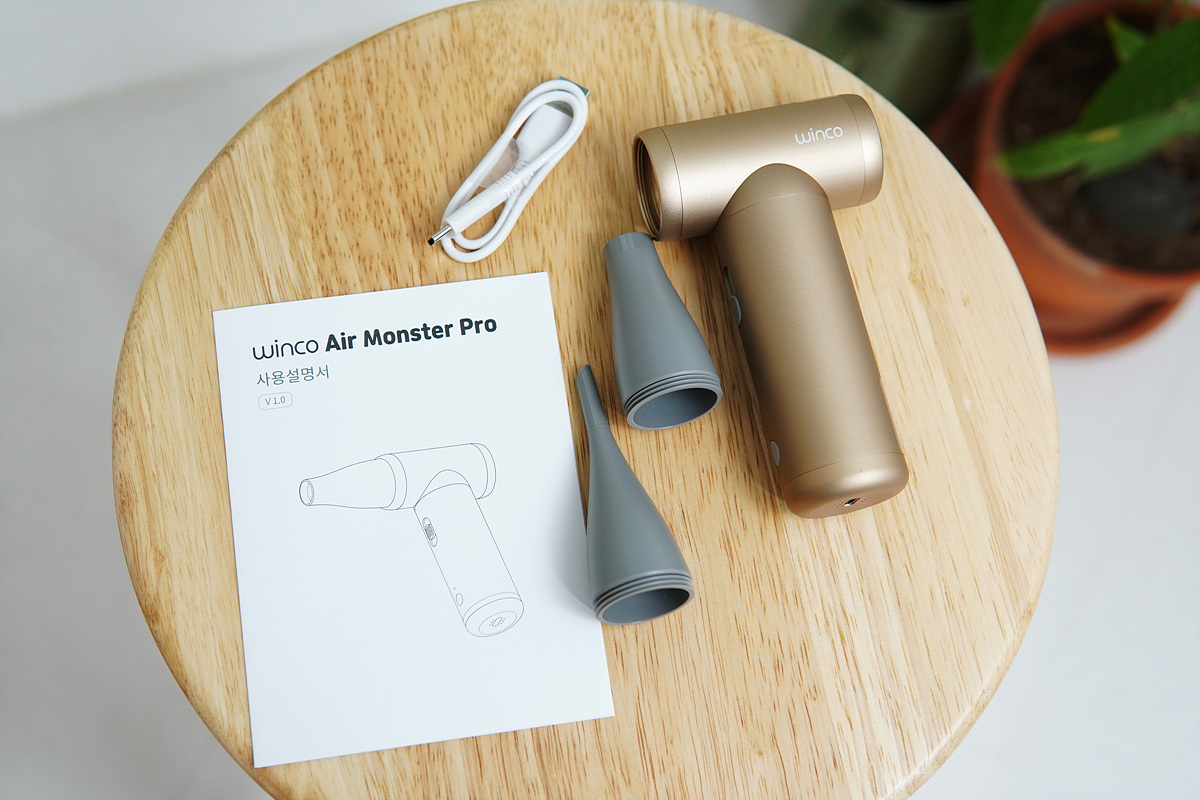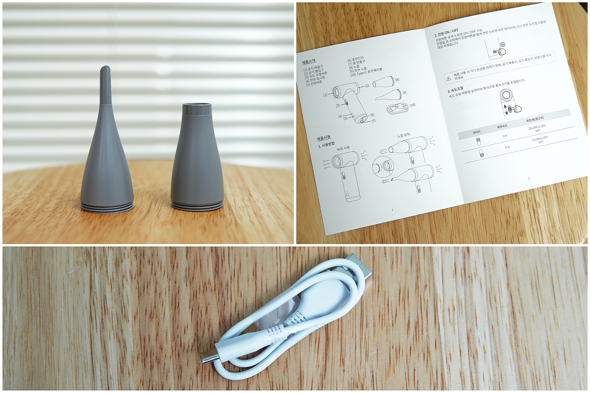구성품은 에어건 본체, 두 개의 노즐, 충전용 케이블과 사용설명서로 이루어져 있습니다.