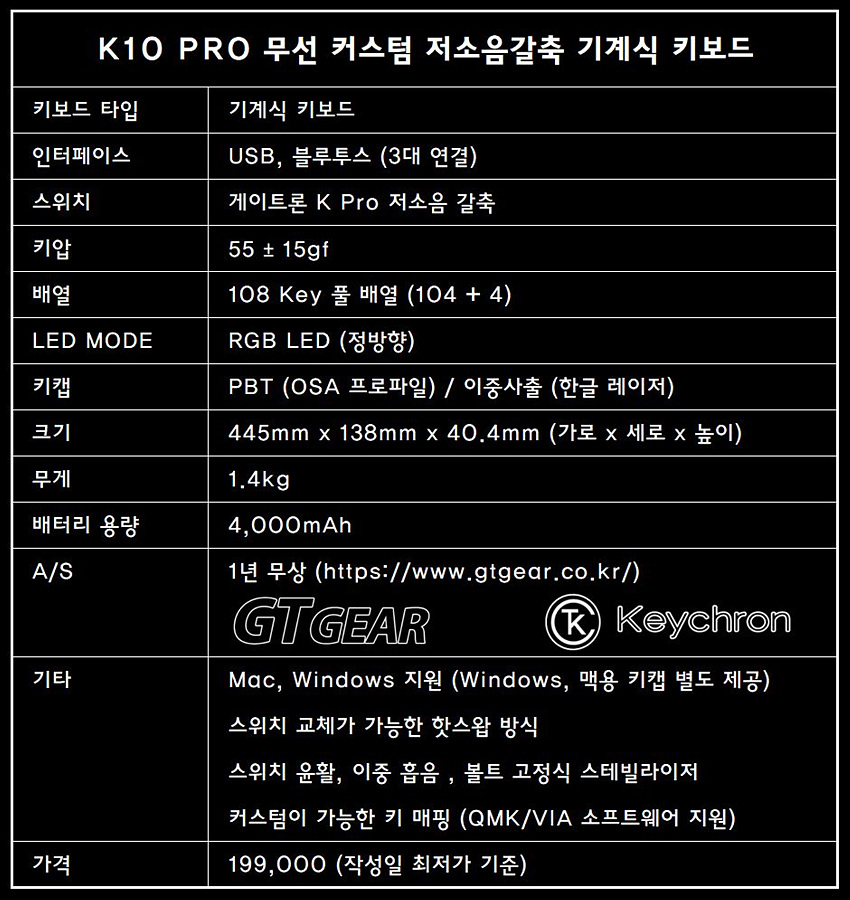 작은 크기는 아니지만 일반적으로 가장 많이 사용하는 풀배열 사이즈이며 유선뿐 아니라 블루투스를 이용 3대까지 연결을 할 수 있어 최대 4대의 기기에서 편리하게 사용할 수 있습니다. 키크론의 특징이자 가장 큰 장점 중 하나인 애플의 맥 환경에서도 완벽하게 사용할 수 있으며 QMK와 VIA를 통해 여러 가지 키조합이나 매핑을 연결되는 기기에 상관없이 그대로 유지할 수 있습니다. K10 PRO의 모습이나 기능 그리고 타건감은 어떨지 살펴보겠습니다.