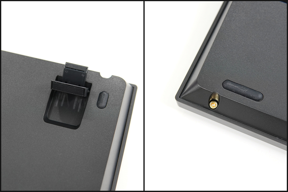 키보드 높이 조절용 다리는 두 개가 있어서 3단계로 조절할 수 있고 하우징의 고정은 일반적인 나사가 아닌 육각 볼트로 되어있으며 잘 보이지는 않지만 그래도 금색이라 조금 더 고급스럽게 느껴집니다.