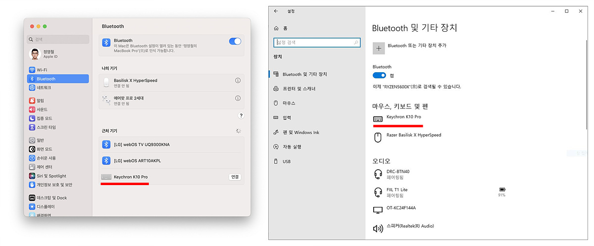 키보드를 연결하면 블루투스와 유선 모두 K10 Pro를 확인할 수 있습니다.