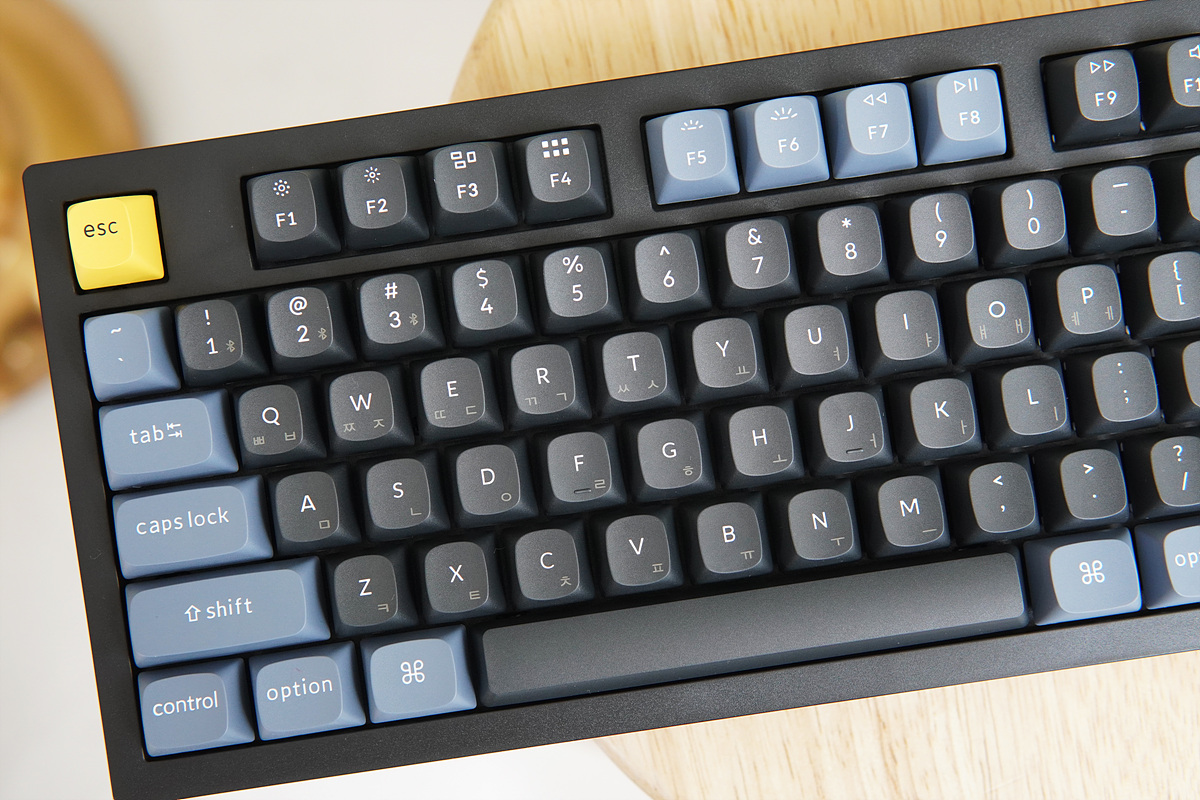 전체적으로 검은색(블랙) 하우징으로 되어있으며 키캡 역시 잘 어울리는 블랙 / 블루 두 가지 톤으로 되어있습니다. 첫인상은 상당히 단정하고 깔끔한 느낌이었습니다. 키크론의 Q8 Retro 제품처럼 밝은 색으로 출시를 해도 꽤 잘 어울릴 거 같습니다. 요즘은 레트로가 유행이니까요. ^^