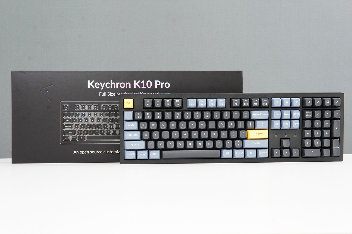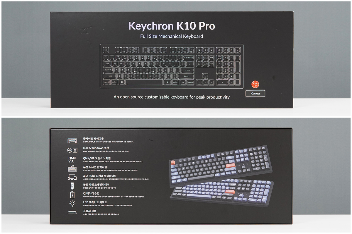 작은 크기는 아니지만 일반적으로 가장 많이 사용하는 풀배열 사이즈이며 유선뿐 아니라 블루투스를 이용 3대까지 연결을 할 수 있어 최대 4대의 기기에서 편리하게 사용할 수 있습니다. 키크론의 특징이자 가장 큰 장점 중 하나인 애플의 맥 환경에서도 완벽하게 사용할 수 있으며 QMK와 VIA를 통해 여러 가지 키조합이나 매핑을 연결되는 기기에 상관없이 그대로 유지할 수 있습니다. K10 PRO의 모습이나 기능 그리고 타건감은 어떨지 살펴보겠습니다.